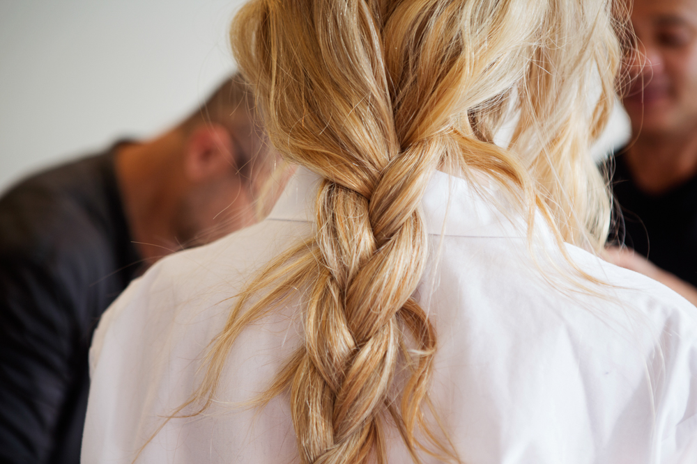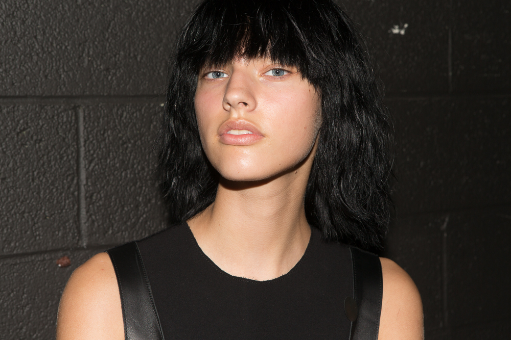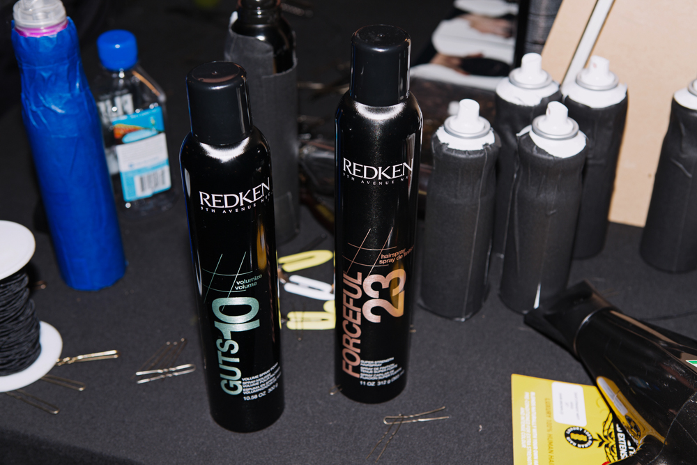 Odile Gilbert (Kérastase): “It’s a feeling of summer and holiday, because no one gets enough holiday! And we were very inspired by Herb Ritts’ photos—it’s all about the oil on the body. Think Helena Christensen with Chris Isaak—so sensual. To get that wet look, we’re using a ton of the Femme Fatale Blow Dry Gel and then on the bottom length, we’re using a lot of the Keratin Thermique, which launches next month and protects hair from the flat iron. On the very ends, we’re spritzing some Laque Noir and before the models walk, we're finishing it off with Gloss Appeal Instant Shine Top Coat for Hair.”
