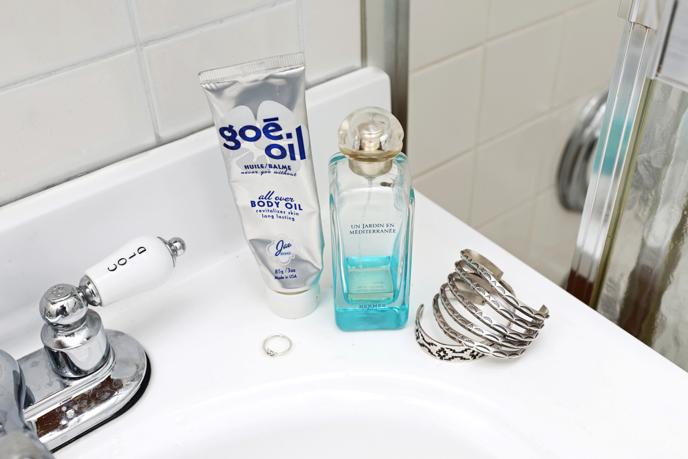 My favorite thing to use is goe oil—it’s amazing. You gotta really rub it in or you’ll be like an oil slick. But you can put it anywhere, sort of like Vaseline—my lips, my eyelids...A good alternative to that is Paw Paw’s Ointment. It’s from Australia and it comes in this crazy red tube that I have in my bag everywhere I go. You can use it on open wounds—it’s that good.