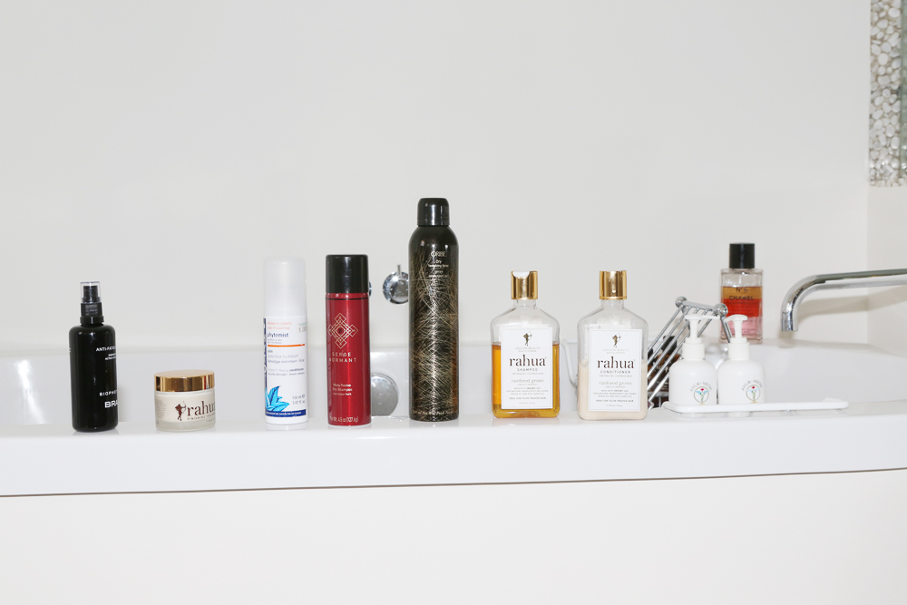 Now, my hair’s just crazy, I really don’t know what else to tell you. It kind of has a mind of its own and it does its own thing no matter where I go. The best is when I’m on an island and it’s really humid, and it’ll get curly. The Oribe Dry Texturizing Spray gives a lot of cool texture and is kind of dry shampoo-y. I’m kind of obsessed with this new brand, Rahua. I have their shampoo and conditioner and it’s great.