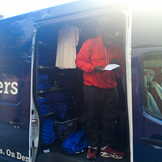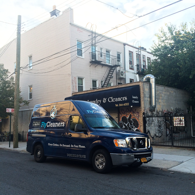 But then I serendipitously started seeing these giant blue vans labeled Flycleaners all over the city. They say you need to see something seven times before catching on—and I was seeing these trucks at least twice a day for months.