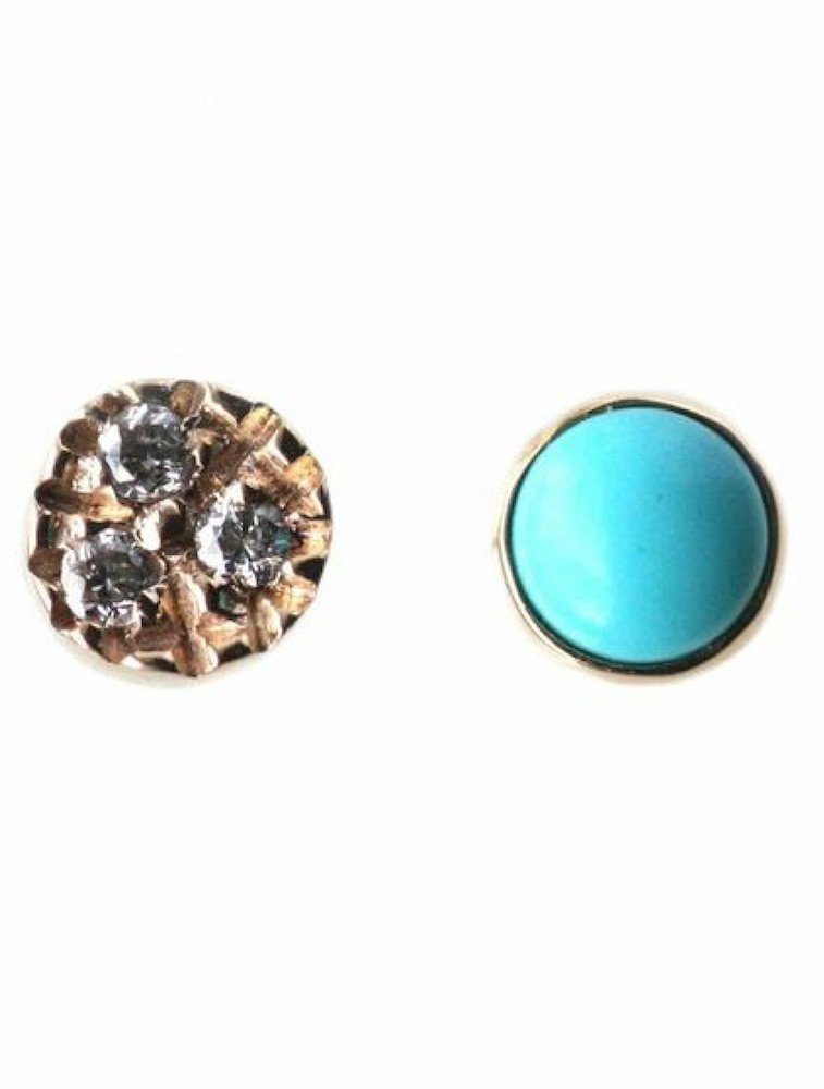 Mociun Mismatched Circle Studs : Knock out two trends with one stone—brassy gold with shiny accents on the left, and a mesmerizing stone on the right that brings back mood ring memories.