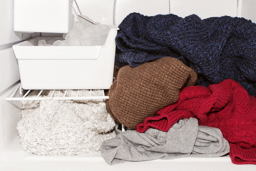 'When I'm not traveling or on a plane, I keep my blanket set in the freezer, because England has a weird moth problem. We keep a lot of our knitwear in bags, just in case, and instead of making this blanket complicated to get to, I just put it in a freezer. People will come over and think it's strange, but it kills the moths' eggs. It doesn't harm the fabric or anything. Actually, I have an Alaïa skirt that lives in the freezer, too, because I'm terrified of them eating that.”