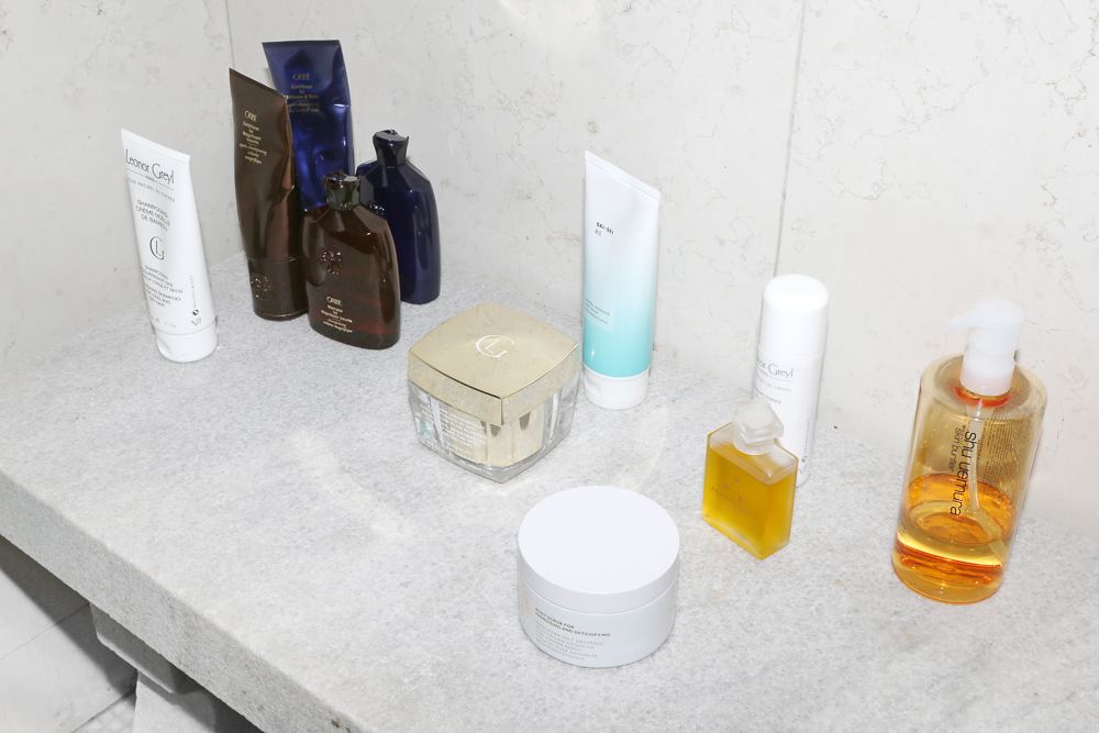 Sometimes with hair products, I’m not sure if they’re right for my type of hair, but I buy them anyway. I’m trying to get some volume going on here. Show Beauty Divine Thickening Lotion is really good for that. A hairdresser in London showed me Super Million Hair, which is more of a fiber than a volumizer—I use it around my part mostly. I should use more of the Oribe Supershine Moisturizing Cream because my hair I still dry from the summer. Their Grandiose Hair Plumping Mousse Thickening Spray is awesome, too.