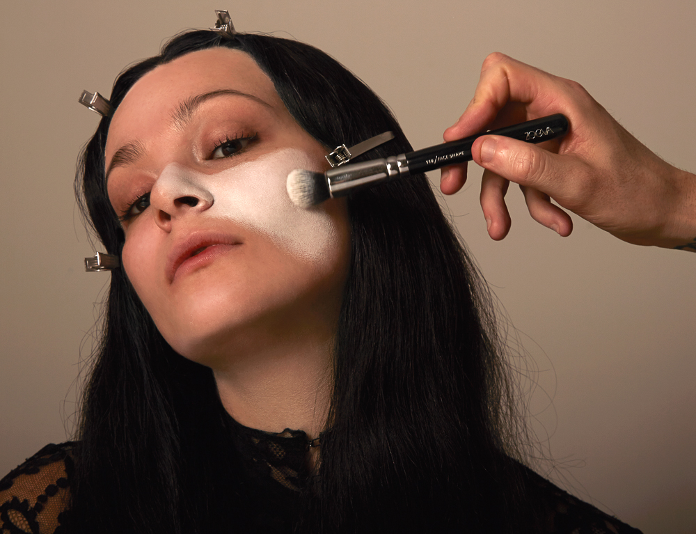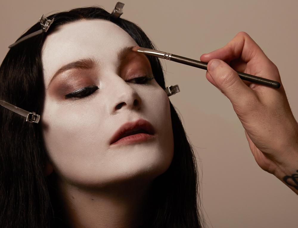 Then, as Kate sucked in her cheekbones, I applied more of the Kevyn Aucoin Sculpting Powder with the Tom Ford Shade & Illuminate Brush to the hollows, working the brush from the base of the bone and into the ears and hairline. I wanted a strong and severe yet blended contour, so I also used Charlotte Tilbury’s Film Star Bronze and Glow Face Sculpt and Highlight to capture light and add further definition, using the highlighter just above the contour, on the jawline, and along the forehead. Morticia is all about those angles…