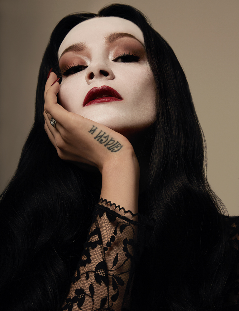 Cyndia Harvey, hair : “For the hair, I got a lace-front wig—they are worth the investment—and used Babyliss medium-width Curling Iron to get a curl running through it, before brushing it all out. We got a '30s-style wave like the original Morticia—and, by curling the front sections of the hair upwards and backwards, we achieved her trademark double-cowlick. Finally, I coated it all in Bumble and bumble Shine On Finishing Spray for a super-glossy finish.”