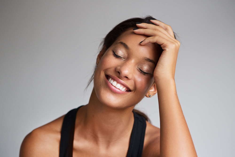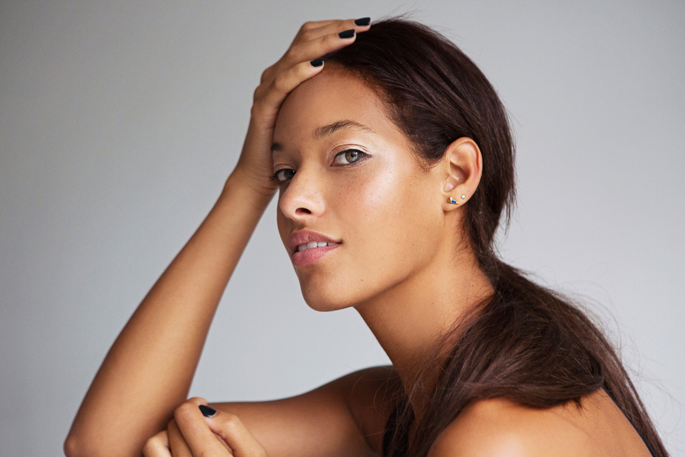 Rainey Forkner (New York Model Management) photographed by Tom Newton in Dolce & Gabbana Perfect Mono Cream Eye Colour in Gold Dust (on the top lids) and Dahlia (under the eyes, applied with an angle brush), The Lipstick in Honey (on her cheeks), and The Nail Lacquer in Verde Bosco. Makeup by Annie Kreighbaum.