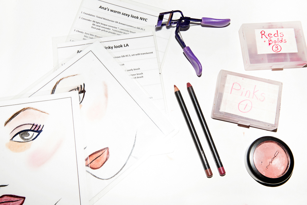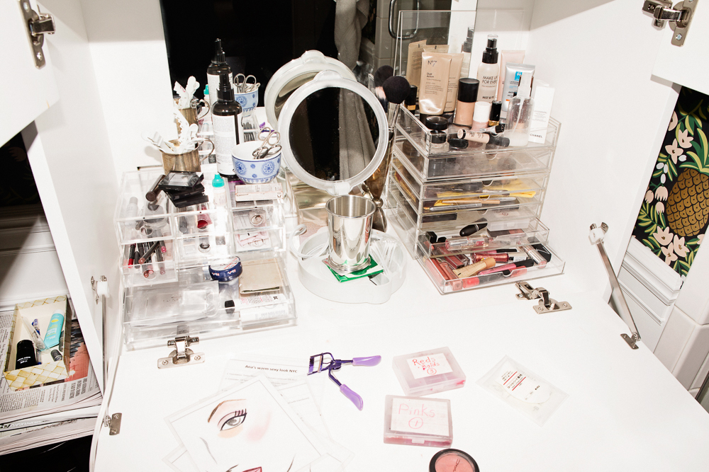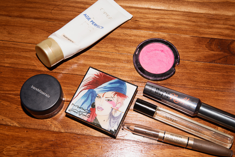 I only wear foundation if I’m auditioning for something—if I’m just going to drop off the kids or do a voiceover job, I don’t need to. My traditional day-to-day face would be Laura Mercier Tinted Moisturizer in Fair, MAC Lip Pencil in Soar or Spice, tinted Burt's Bees chapstick, and I’ll always do that Revlon Brow Fantasy with some mascara over it. Lashes are really important—I have really deep set eyes and curling them makes you look a little more alert. L’Oréal Double Extend Mascara is great because it goes on, it stays on, and the only down part is that you have to be very careful taking it off because it'll yank your lashes out if you rub too hard. I use Brownish Black or a Black, depending on what I’m doing. I always have my Bobbi Brown Eye Pencil in Black Navy with me. Something that you learn in your 40s is that you actually have to reapply blush throughout the day. So I’ll put on MAC X Antonio Lopez Violet Cream Blush and then I’ll powder Makeup Forever HD Blush over it.