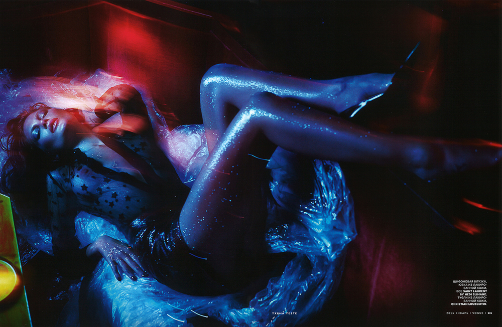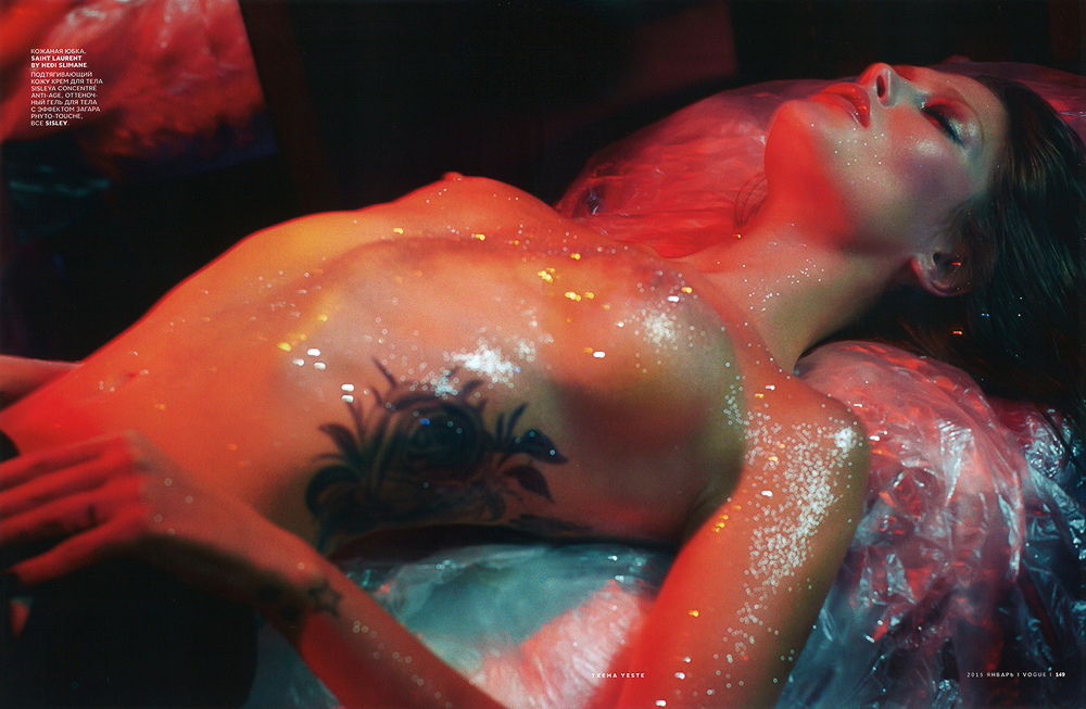But the thing is, I don't like fashion for its reality. I'm here in search of entertainment—a lot of glamour sprinkled with a little escapism. So for me, Christmas came early in the form of this month's Vogue Russia. Featuring my personal favorite, Cat McNeil, definitely not looking like herself. There's glitter, strip-club lighting, stars, some leather, fishnets...many things Cat is decidedly not when you meet her in person. Love her, but this makes my heart literally sing.