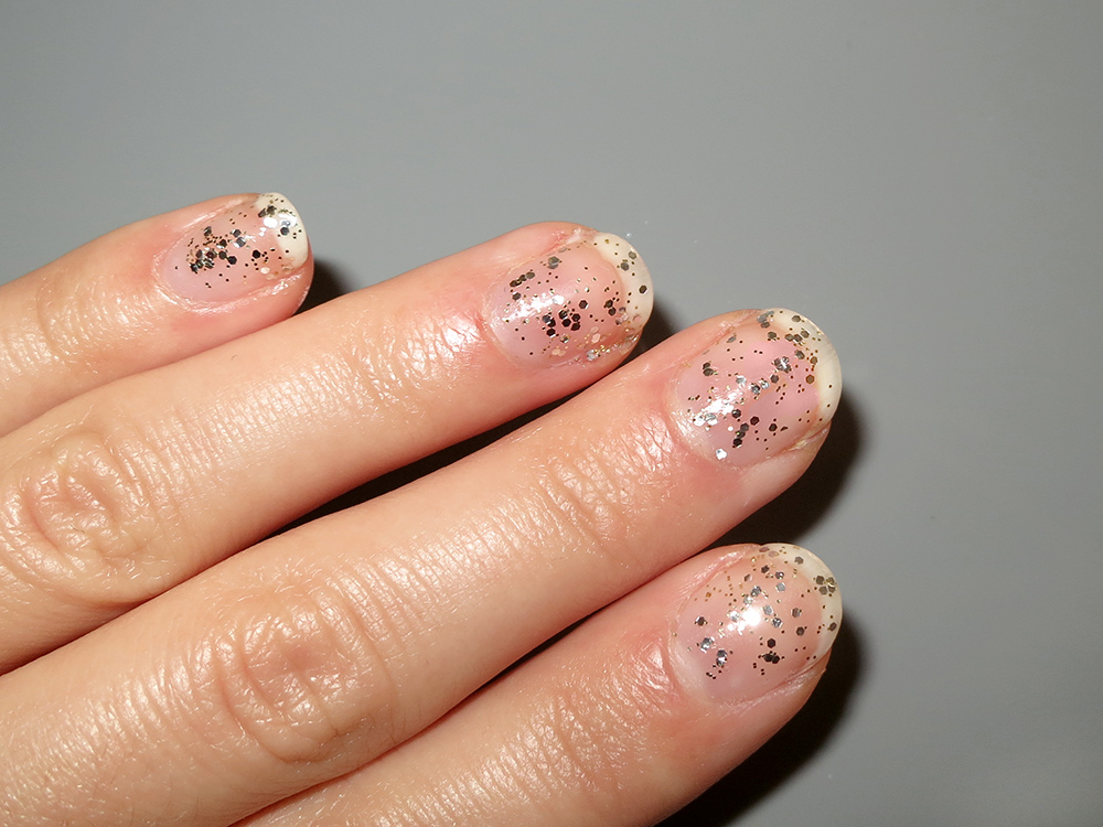 The Parure Scintillante is a mix of tiny silver hexagonal glitter flecks and tinier antique gold sparkles. The brush is short, flat, and round, making the dabbing-on process that glitter polish requires not so clumsy. I like the subtlety of one coat, and leaving tiny flecks fairy dust in my wake as I mindlessly chip it off while watching Dateline—the most common and effective method of glitter polish removal.