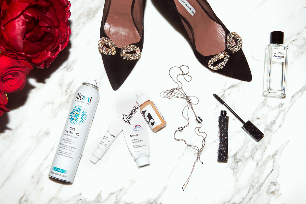 And now, to makeup. Don’t kill me! Don’t kill me. I’m not wearing any. Just the Glossier Phase 1 Set: the Priming Moisturizer, Perfecting Skin Tint, and Balm Dotcom. And! And. Gucci’s black mascara, on the bottom lashes only (picked it up for the OTT packaging; kept it for the formula). Some of you might say Ah, how boring. Another person who doesn’t wear makeup. I love makeup. It’s in my blood. I just don’t like adding a bunch on at night right now. I think it’s way cooler to do a day look for night, both for hair and makeup. And wear something super chic. Mixing high-low is always the most fun, in my opinion.