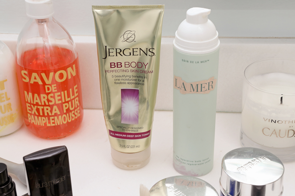 I love Le Labo Santal 26 and the body wash from Alba Botanicals that smells of rose. I buy a big ass tub of Tuberose bath and shower gel. Then, the best stuff ever is Jergen’s BB Body Perfecting Skin Cream. It’s the best in medium-deep skin tones and it smells so good. But I also love La Mer’s Reparative Body Lotion.