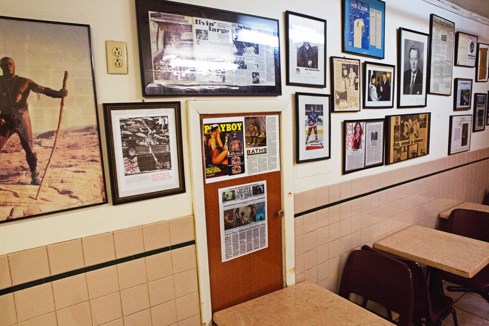 But the heat had already gotten the best of me. Too faint to reply, I wobbled out of the Russian Room and up to the restaurant to buy a much-needed bottle of water. I recovered in the dining area, surrounded by walls of framed, signed celebrity headshots from the '80s. A group of half-naked old men shared pickled radishes at a table next to me.