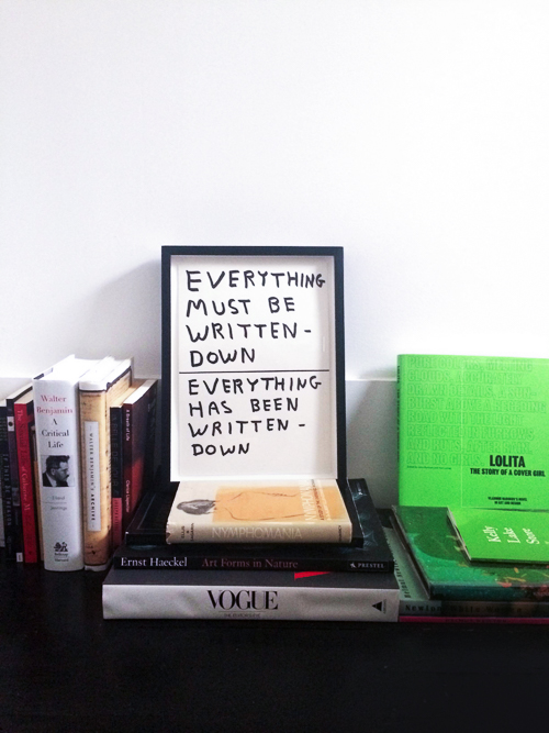 How and where you place your art is entirely subjective. Writer Stephanie La Cava prefers an undone approach, using map tacks to pin a Carol Bove print to her wall. Or, placing framed art on top of limited edition artist books from Karma or Fulton Ryder. For inexpensive, ready-made frames try A.I. Friedman. A semi-custom framing trick: buy a pre-made frame but have the matting custom cut. For entirely custom framing, try a small, locally owned framing shop. (Pascua recommends Brentano’s for the New York City set.)