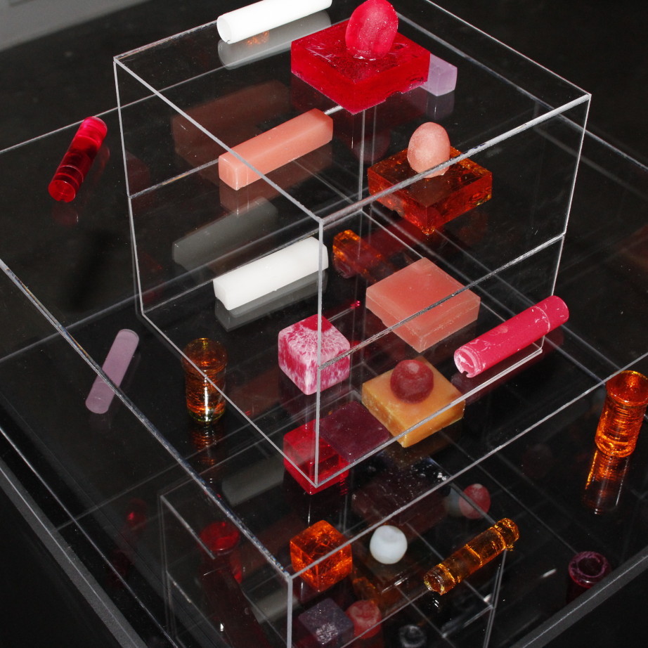 'I wanted to paint because I wanted to emphasize the minute gestures and details of my personal life. I found that my deepest desires were embedded in seemingly minor occurrences, fragments of thoughts, and persistent emotions. The symbology of color informs my navigation through life, and painting as well as resin gave me the tools to express that journey. Moreso than any artist or artistic movement, I have identified with the people who surround me and their ways of seeing and doing. There is no end to the stream of new information one can tap into if they are watching and listening closely; although seeing an artistic peer's work is like a giant burst of energy, a painted-over concrete walkway amongst acidic grass lawns might be the real inspiration for a new painting. The sculptures represent the desire; they are created with a longing to possess the immortality and translucency of plastic, yet with so little commitment that they are almost disposable objects, things to be bought at the checkout counter and thrown away after a month or so. They give artistic prowess to my lifetime hobby of collecting and arranging small objects, styling outfits, or arranging flowers, by allowing me to endlessly play with color palettes and groupings of shape. My artwork is meant to be a gift to those around me; I paint who and what I see, and make sure that the proper owner of a piece is given it. So far, this has not involved financial transactions, but rather an exchange of understanding and therefore putting to rest ideas and dreams that had formerly existed solely as such.” —Jessica Dean Harrison