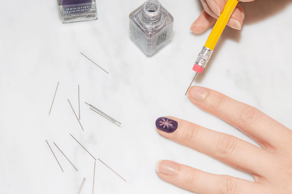 Any attempt at nail art will require a few tools. Jin Soon recommends applying nail polish with an old mascara brush for a Jackson Pollock-inspired abstract art effect. Get a few spoolies going in a few different colors and see where the muse takes you. For a more precise touch, use a dotting tool, with which you can paint on an infinite variation of flowers, polka dots, and squiggles. Jin Soon suggests also doing 'negative nail art' by scraping designs into freshly applied nail polish. Don’t have a dotting tool? Madeline Poole makes her own: “Take a sewing pin—the kind with the ball on the end—and stick it into the end of a pencil eraser.” Ta-DA.