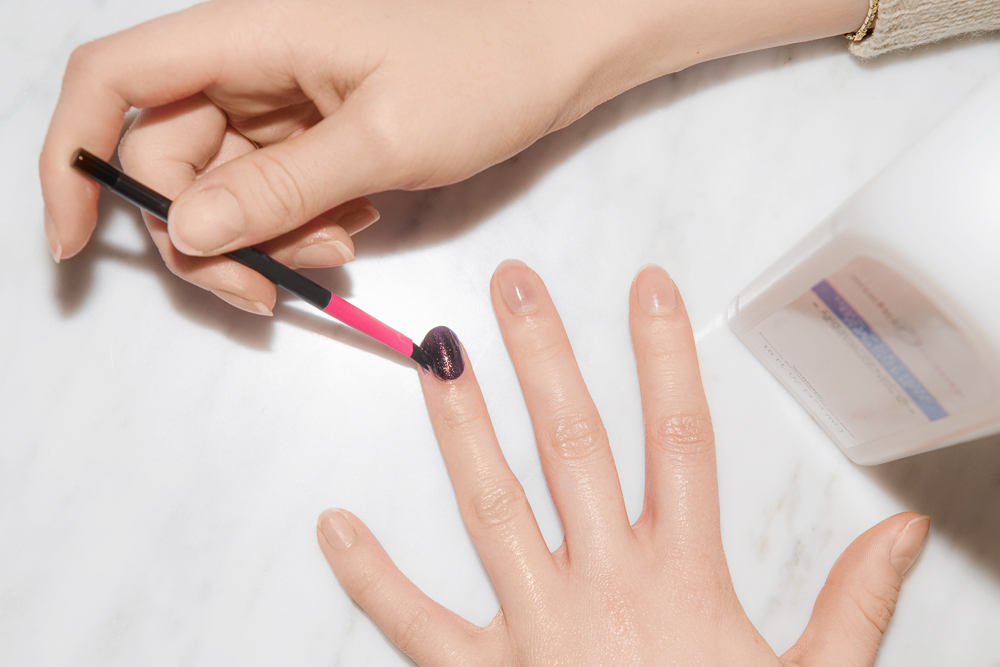 Cleaning up the nail afterward is just as important as the painting before. Alicia uses an angled eyebrow brush dipped in acetone for precision cleanup. It’s helpful to have micro Q-tips nearby too. If you’re not good with that kind of precision, Deborah Lippmann’s got an easy fix: “If you find polish has wandered off your nail plate upon application and [you] don’t feel confident using cotton and acetone to fix these flaws—often the case with shaky hands!—simply wrap cotton around a stick, dip it in hot water, lightly press it onto the area, and let it soak in. It should magically come off.” But if by this time you are well into the Netflixing-and-drying stage of the manicure and only realize there’s polish everywhere later, it’s still OK. She assures: “If you notice that you or your manicurist went outside the lines with lacquer, don’t worry about it! Wait until you take your first shower and it should easily peel off this area. Nail polish is not meant to adhere to the skin so it should lift right off.” Gotta love the easy ones.
