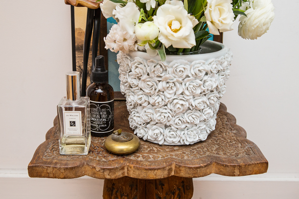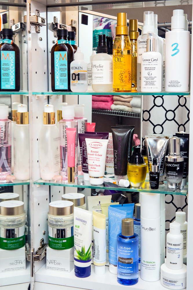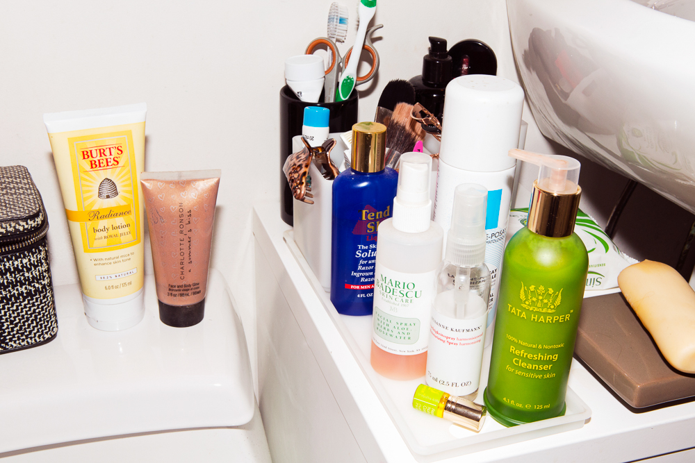 The first beauty product I ever bought was Clinque’s 3-Step Skin Care System—the soap, toner, and moisturizer. I still use a three-step system but not with Clinique these days, I change it up. Right now, I use the Tata Harper Regenerating Cleanser and then Natura Bissé The Cure Toner—it lasts forever, I’ve had this one bottle for for such a long time! I love it because it’s a spray and I really love to spray my face with stuff—I have this Susanne Kaufmann Harmonizing Moisturizing Spray, and then the Mario Badescu Rosewater Spray and the La Roche-Posay Thermal Spring Water spray. The best one, which I ran out of, is the Caudalie Beauty Elixir. So good! And it’s herbal smelling, like nothing else in the world…