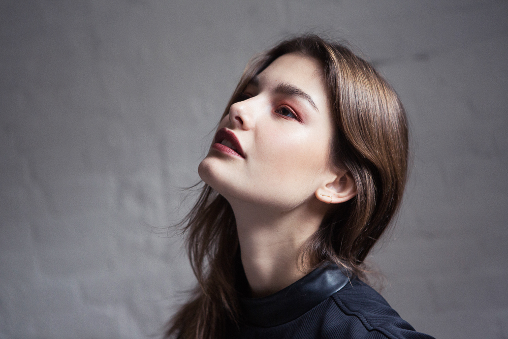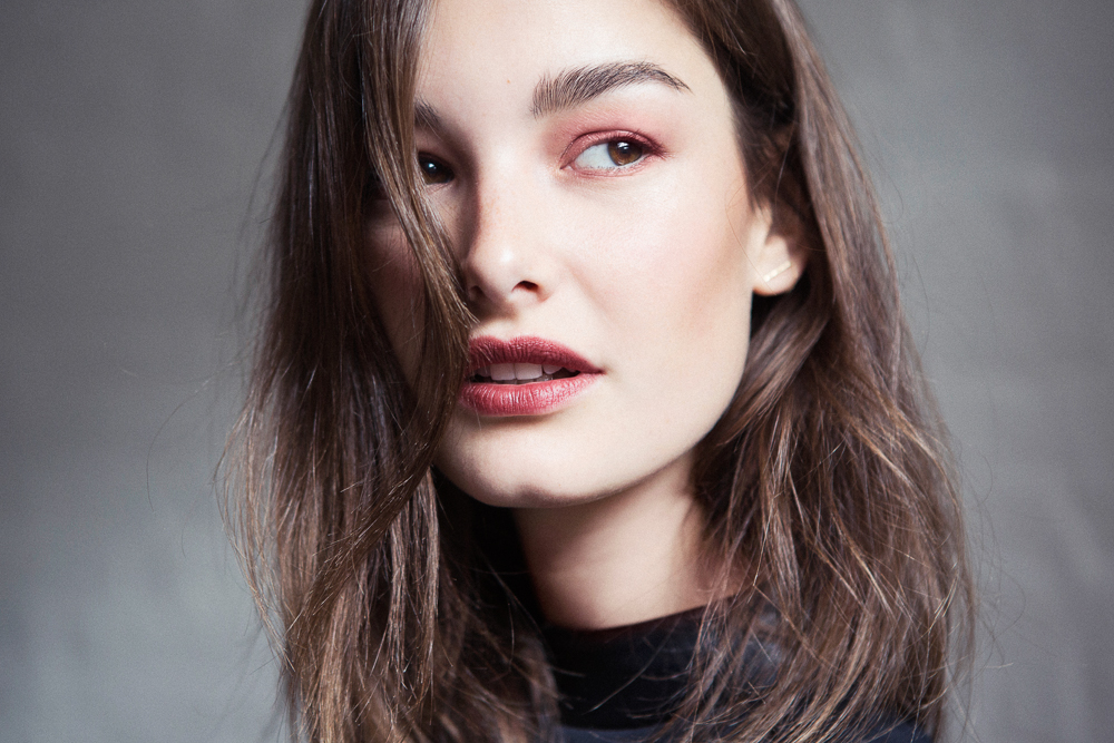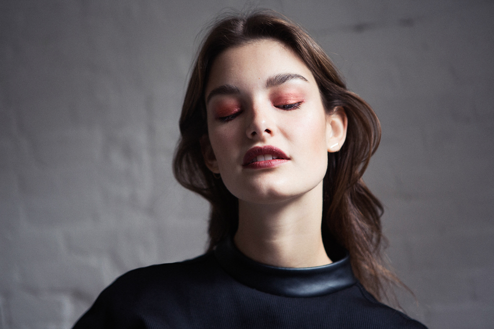 Ophelie Guillermand photographed by Tom Newton. Lancôme Hypnôse Dazzling Eye Shadow in Rouge Cabaret, Marc Jacobs Beauty Twinkle Pop Eye Stick in Leila , Marc Jacobs Beauty #Instamarc Light Filtering Contour Powder, and Butter London Lippy Tinted Balm in Black Cherry .
