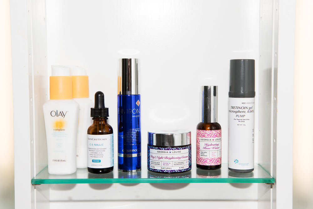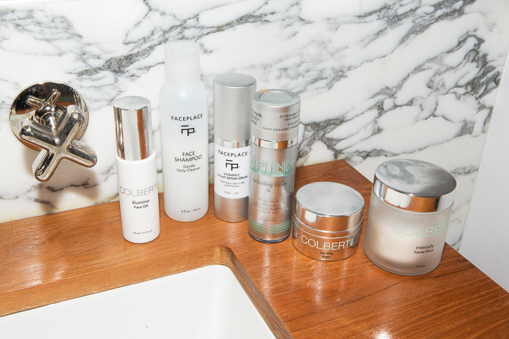 I have always had really dry skin and I never even used to use a cleanser. Tom, the guy at Face Place, told me that was abominable. So now, in the evenings, I wash my face with the Face Place Face Shampoo and then I use the Dr. Colbert or Georgia Louise stuff. Dr. Colbert does a great Illumino Face Oil, and a great night cream that I use for the day, too. And he gave me these cleansing pads that are amazing, that work as an exfoliator. So I either use one of those or this Vitamin C repair…I can never keep track of everything, so I just try to rotate between it all because I know somewhere they’re like, 'Use this once a week.' Now, I feel like my skin is really moisturized without ever feeling sticky, like how some of the thick creams can make it feel. Georgia Louise just gave me this face roller but I just don’t have time to deal with all that stuff. I do love the idea of it and she uses it during the facials, but it just takes so much time and I’ve got so many other things I want to do. I should start doing it again…