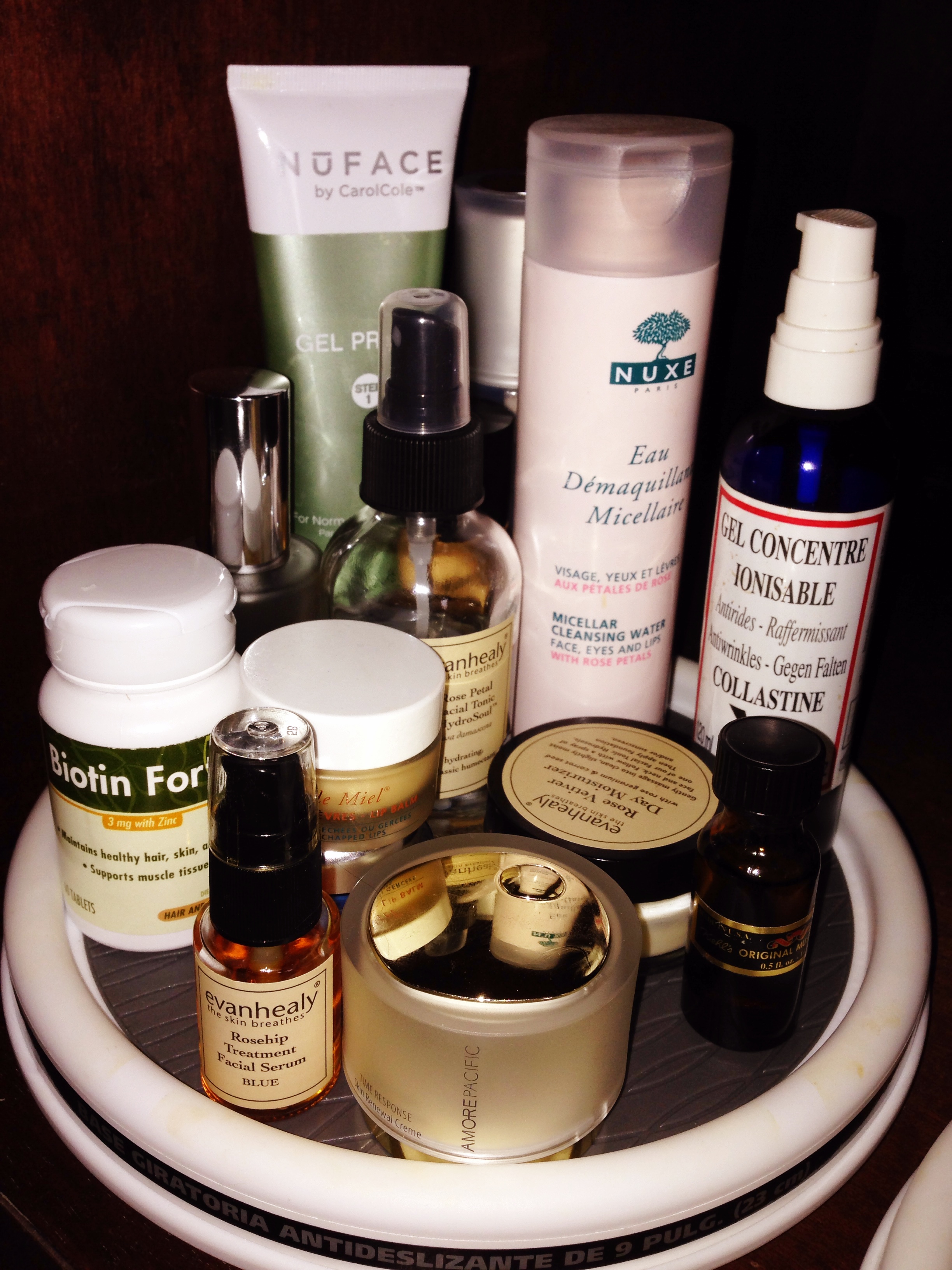 My nighttime trifecta is Amore Pacific Time Response Skin Renewal Serum, the Evan Healy Rosehip Treatment Facial Serum again, and StriVectin-SD Eye Concentrate For Wrinkles. I pay particular attention to my eyes these days because that's where you age most noticeably. I'll use my Clarisonic Opal Sonic Skin Infusion Systemwith my eye cream to get the most out of my product there. Sometimes I also like to apply a facial mask from Chicet, and once a week, I'll do a treatment using tretinoin, which is generic Retin A, to increase cell turnover. It's good for my skin because it doesn't thin the skin, and after, I top the treated area with Biafine to heal.