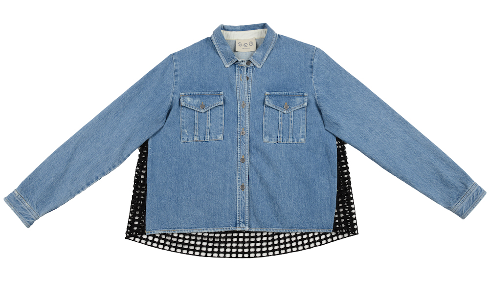 Sea Eyelet-Back Denim Shirt-Jacket: This piece is part-jacket and part-eyelet that's more mesh in shape and less running-through-fields-of-daisies-in-the-summertime.