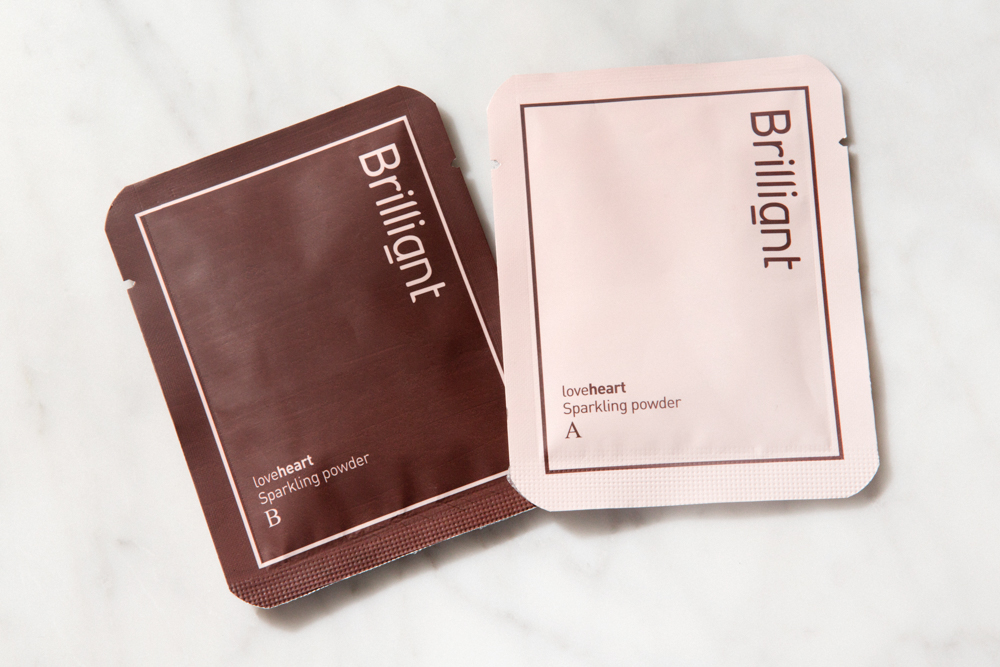 However, regular sparkling water can be irritating for very sensitive skin types. But never fear, there's a product for that: Brilliant’s Loveheart Sparkling Powder . Recently featured on popular Korean beauty show Get It Beauty, the powder acts as both an exfoliating cleanser and facial mask. When packets A and B are mixed in 5-liters of clean water, the powdery concoction fizzes up into a bubbly, skin-purifying facial pack that you submerge your face in for 3-5 minutes (with periodic breaks to breathe, of course). The same water can be used to cleanse, as well. This vitamin-infused solution promises a 7-in-1 effect (that's brightening, hydrating, firming, balancing, exfoliating, controlling oil, and cleaning, if you're counting).