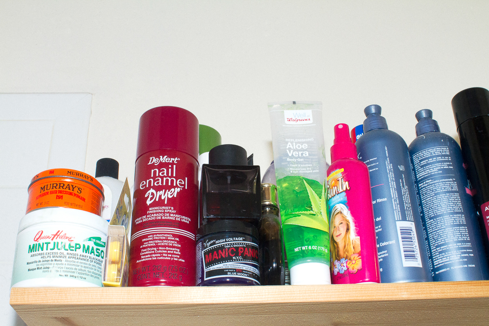 My hair has been every color—most recently blue. The other day, I just put on some Manic Panic Semi-Permanent Hair Dye in Cotton Candy Pink until it dried. The pink is nice because it doesn’t bleed as much. When I would go out with longer hair, I would blow dry it first so it would be huge, and then I would usually slick it back into a ponytail or a high bun. It used to be down to my shoulders, but all the damage has made it dry, and I got so frustrated with it that I just shaved it off. I’ve always wanted thin, pin-straight hair, like Olivier Theyskens—or even Kurt Cobain's kind of stringy, thin hair—but my hair’s so thick and wavy. My mom’s from Peru and my dad’s from Poland, so my hair’s curly-wavy. Mane 'n Tale has made it really manageable though. I've been using it for three years, partially because the bottle is so huge. Right now, I'm just using the conditioner because my hair is fried and I don't want to wash it as much. But I do think I’m going to bleach it again soon.