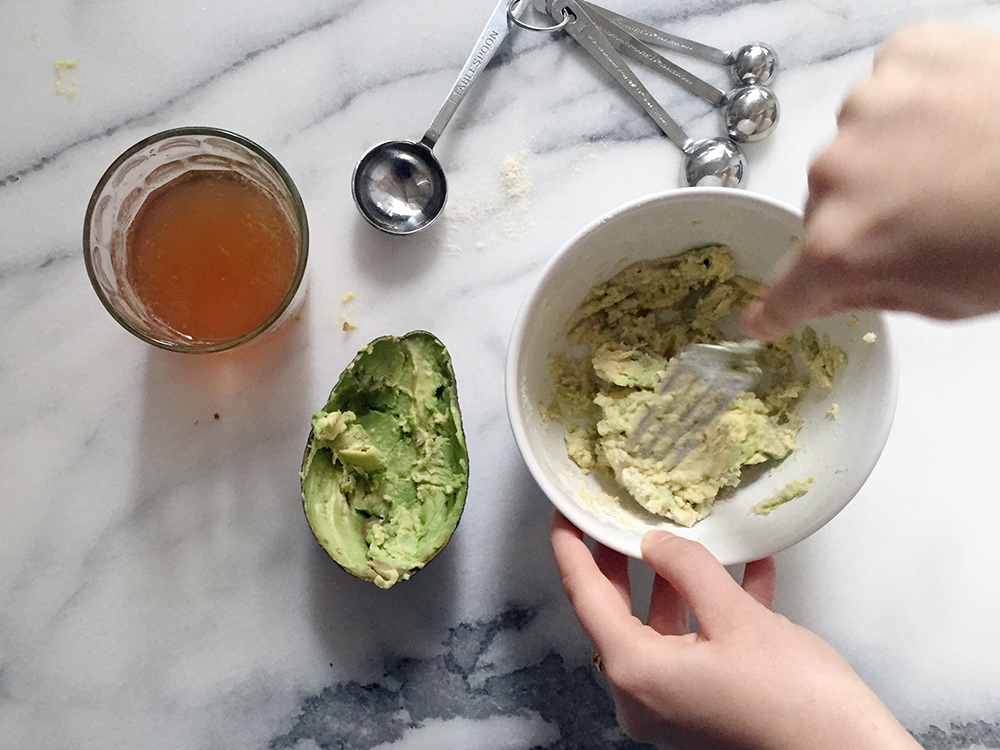- In a small bowl, mash the avocado with a fork and sprinkle in the rice flour, stirring until you’ve created a paste.