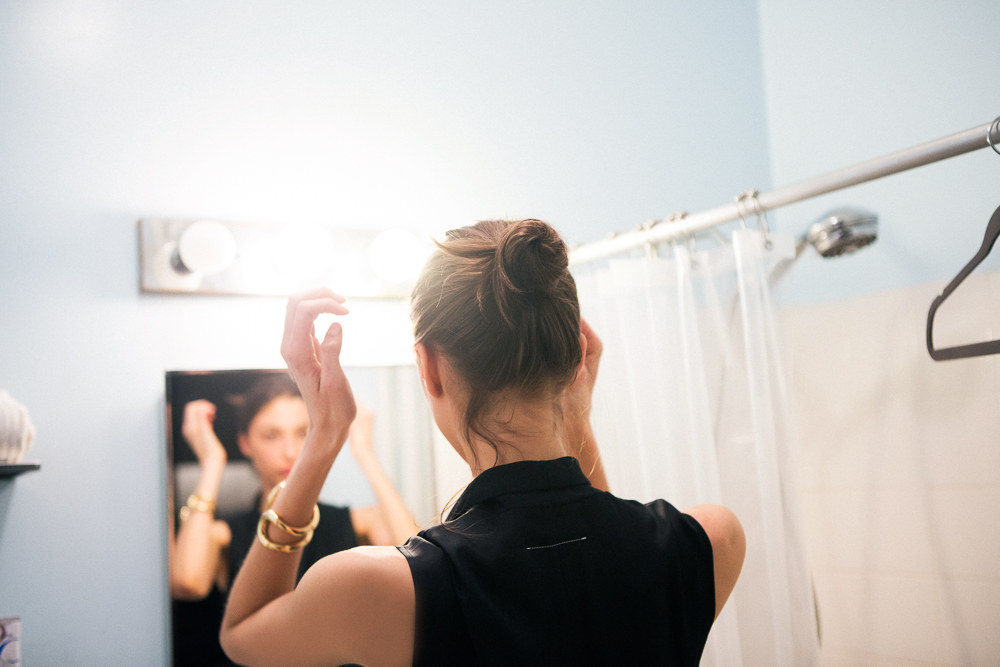 Sometimes I think it’s best not to stop and de-stress, because otherwise, I’m not going to want to go out again. Whenever I come home from a big day, I always have a lot of adrenaline from work, so I'll usually put on really pump-up music, keep on my makeup, and go on that train of thought to just be positive and fun about the night ahead. Alternatively, I'll chill and have a really long shower. I'll make sure I have time to clean everything off—be really raw—and feel really refreshed when I go out.