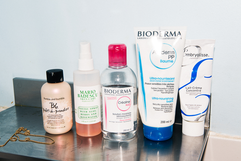I’m not completely against makeup. Put me in a chair with Pat McGrath, Aaron de Mey, or some amazing makeup artist, and you can do whatever you want. I’ll sit there for 10 hours, and I’m fine and happy. I love the process. I love seeing whatever’s created on my face, and if it makes me look ugly in a really cool way then whatever. But if it’s for me personally, I’ll be like, ‘I don’t want any glitter, I don’t want any shimmer.’ I think it’s about knowing what you want to look like. So if I come home with really cool makeup from a shoot or a show,I’ll just pare it down before I go out and do my own thing. I’ll get a Q-tip and a little pad soaked in Bioderma and kind of alter it a little bit. My favorite thing to do if I had a full-face of makeup on is to take off the blush and everything else and leave a little bit on the eye. I really like leftover makeup. That’s probably my other favorite—like no-no- no makeup or leftover makeup from a big show. But at the end of the night, I always take it all off and drink a lot of water.