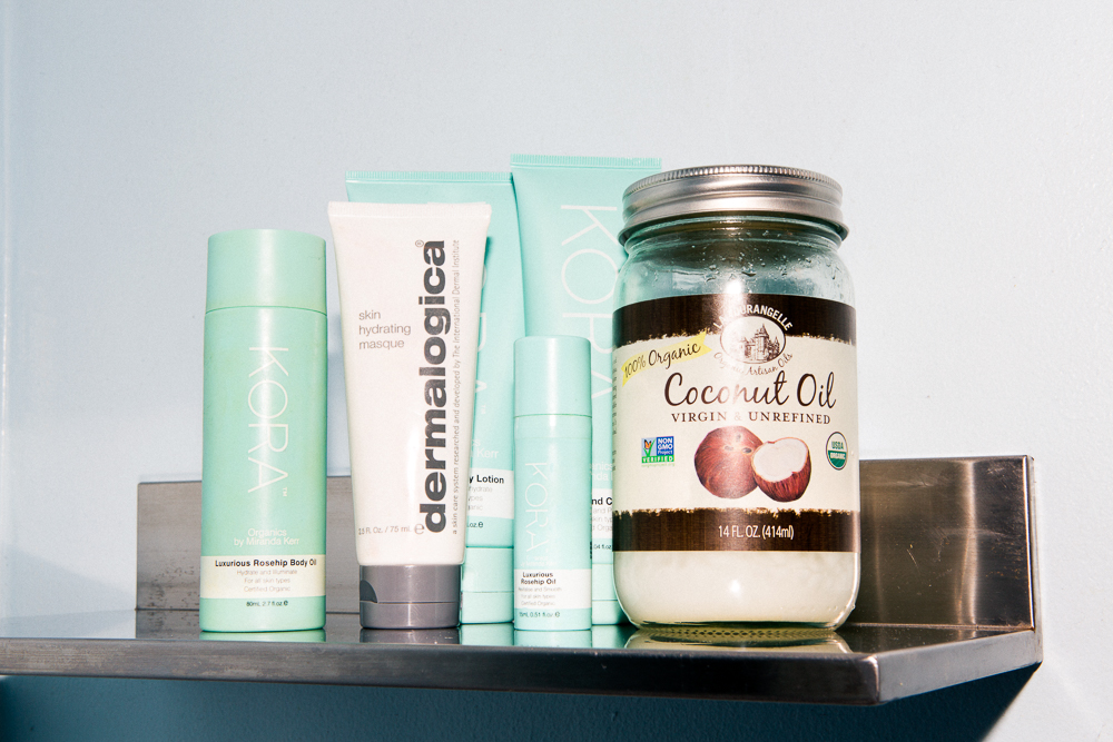 Before I shower, I dry brush my skin, and then once I'm in the shower, I use Dr. Bronner's 18-in-1 Pure-Castille Soap in Rose. I wash my face with Dermalogica Daily Microfoliant. It's like this fine, little powder—a good, gentle exfoliator. I guess it does the same thing as the brush for your face, in a way. Then I use Kora Organics by Miranda Kerr Foaming Cleanser—Miranda's a friend so I always have endless supply of her products. Mario Badescu Facial Spray with Aloe, Herbs, & Rosewater is also really good as a toner or spritzer. I use it like a refresher before I go out. A makeup artist used it on me once, and it's so simple, but something about the aloe and rosewater makes it really great. It's also super cheap.