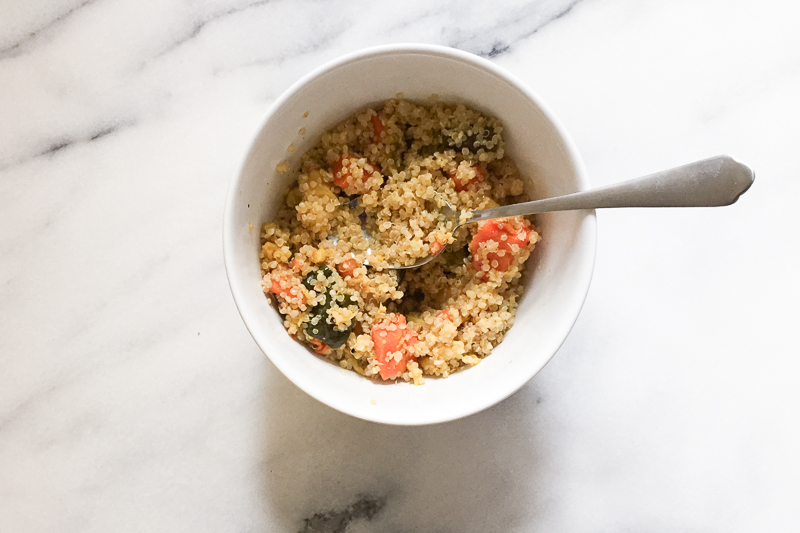 Lunch: When I got home from my workout, my week’s food had arrived. Sweaty and starving, I surveyed the week’s meals on the counter and felt my mood change from excitement to dread. While Beyoncé’s Instagrammed meals had looked delicious, fresh, and varied, these all looked like versions of the same carb-loaded mush. Rice, rice, beans, quinoa, rice...and more rice. Not a fresh veggie in sight.