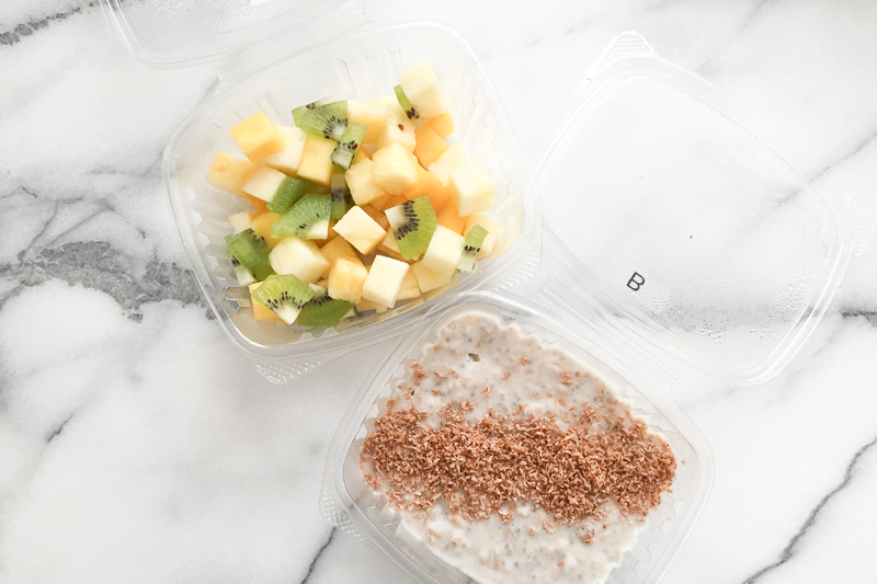 Breakfast : Apparently, I was meant to receive a menu by email before my food was delivered. However, I didn’t get one—so instead, I got to play a guessing game with my meals. I decided that the container that looked like chia pudding (Tricia had said she would include this as it is good for combating inflammation, which I had mentioned as one of my concerns) was probably breakfast. I also ate a container of cut-up fruit. I didn’t feel like I was being particularly virtuous in terms of calories, but it was filling and tasty.