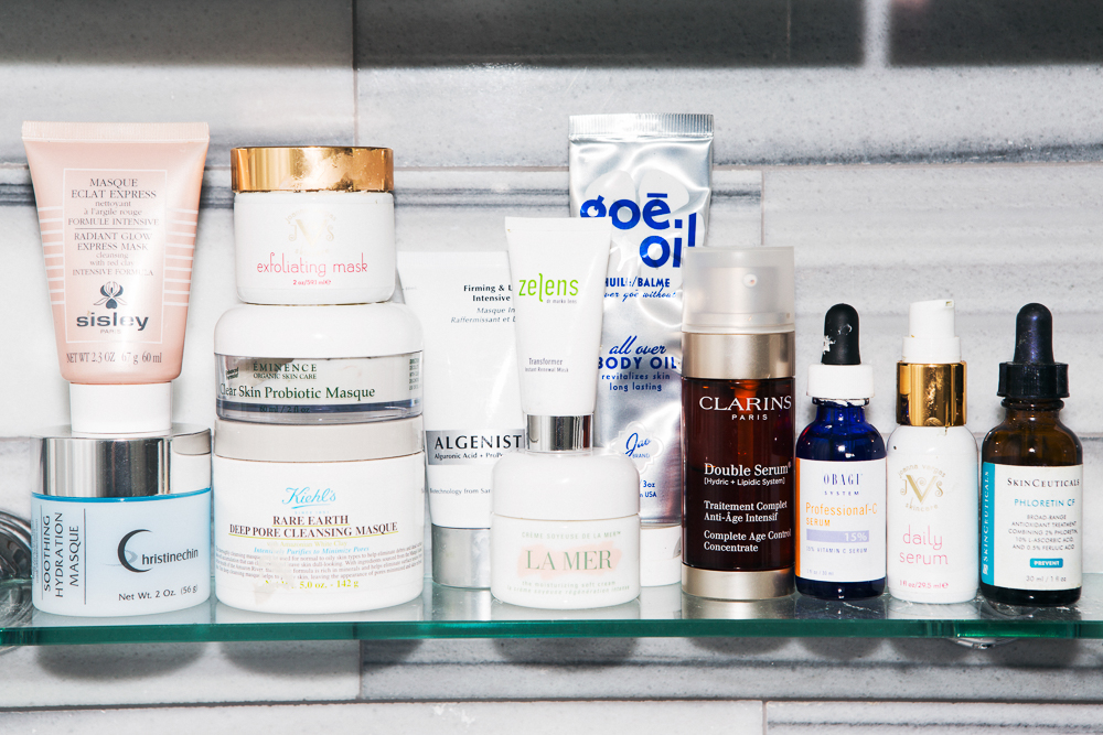 I typically wash my face with Revision Brightening Facial Wash and my Clarisonic. I don't travel with my Clarisonic though, so when I'm on the road and need to take off heavy makeup for the camera at the end of the day, I use Kiehl's Rare Earth Deep Pore Daily Cleanser. I also like to layer my serums—I was told it was OK, so now I use Joanna Vargas Skincare Daily Serum after Obagi Professional-C Serum 15%. I also really like this Clarins Double Serum Complete Age Control Concentrate as well. It makes your skin glow immediately—like you just had a microdermabrasion facial—but if I use it too much, though, it clogs my pores, so I use it sparingly.