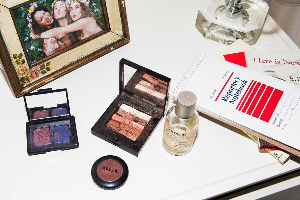 When I was growing up, my aunt was the beauty editor at Allure. So when I’d come to New York with my mom, she would bring me into the closet, and I’d play around with all this cool stuff. It was like the Willy Wonka Chocolate Factory of makeup. Since then, I’ve had to learn how to really do my makeup since I’m always on the road. This Bobbi Brown Shimmer Brick in Bronze is my magic block. I’m obsessed with it and bring it everywhere. My palettes break a lot, but I still won’t throw them away. I’ll just wet my finger, rub it on the palette, and put it on my eye. You can also use it for eyeliner too—even though I think it's just meant to be a blush. I've used Stila Eye Shadowin Twig as liner since high school because I have a green eyes. Then I take a little angled brush and put on a little blueish color along with it, like the blue from the Nars Duo Eyeshadow in Marie-Galante, usually just on the bottom. I also like to take Sephora Colorful Eyeshadow in No. 63 Under The Covers and put it in the corner of my eyes and middle of my eyelid to open them up. I’ll put a little water in the cap of my water bottle and dip the brush in there when I'm on the go.
