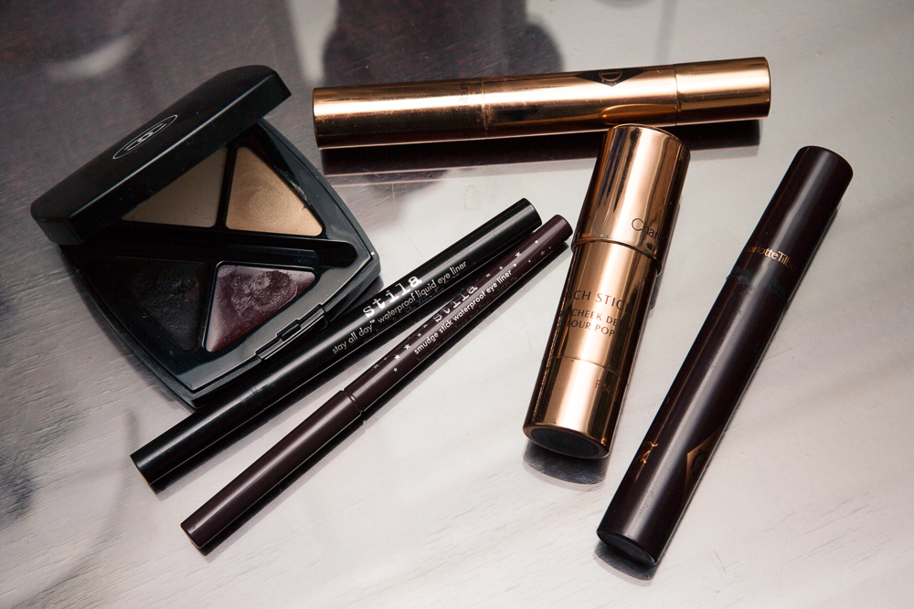 I feel like I get tanner as the night goes on. It’s bronzer—I don’t know why I love it so much. I rotate my favorites. Stila had a bronzer that’s discontinued now, which I adored, called One Step PrimeColor in Bronze Babe. After bronzer, I tap on Stila Convertible Color in Poppy on my cheeks, the bridge of my nose, and a little on my lip. A dewy product like MAC Strobe Cream is amazing—very sheer and not super frosty. Madina Chic & Shine Highlighter Stick Illuminante is amazing as well, though I would say there is a little bit more of an iridescent pinkness throughout the MAC Strobe Cream. I'll put it on my eyelids too and do a little here and a little there. There's also the Charlotte Tilbury Beach Stick in Ibiza for shimmer. I don’t wear a ton of makeup, but when I do it’s different. I like clumpy lashes and things that looks a little imperfect, but I think that’s me.