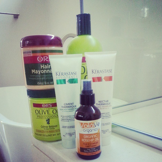 I chemically straighten my hair every four months with ORS Olive Oil Professional Crème Relaxer. Every week I do a deep conditioning mask for 20 minutes using Kérastase Masque Elixir Ultime or ORS Hair Mayonnaise. L’Oréal Evercrème Intense Nourishing Conditioner is also great if you are in a hurry. Three minutes is all you need because it is so thick and moisturizing. For shampoo I use the L’Oréal Evercrème Intense Nourishing Shampoo or Kérastase Bain Elixir Ultime. I also love Kérastase’s leave-in treatments like Nutritive Nectar Thermique and the Résistance Ciment Thermique. If I am flat ironing that day, I will also use Kérastase Résistance Fibre Architecte. Kérastase products are the bees knees—they always make my hair so soft and strong.