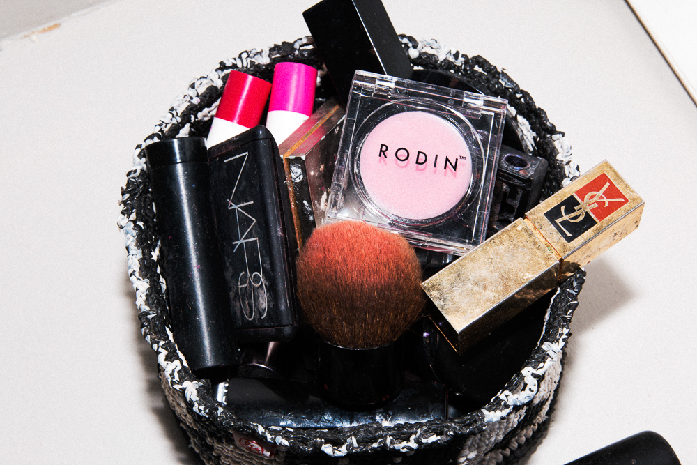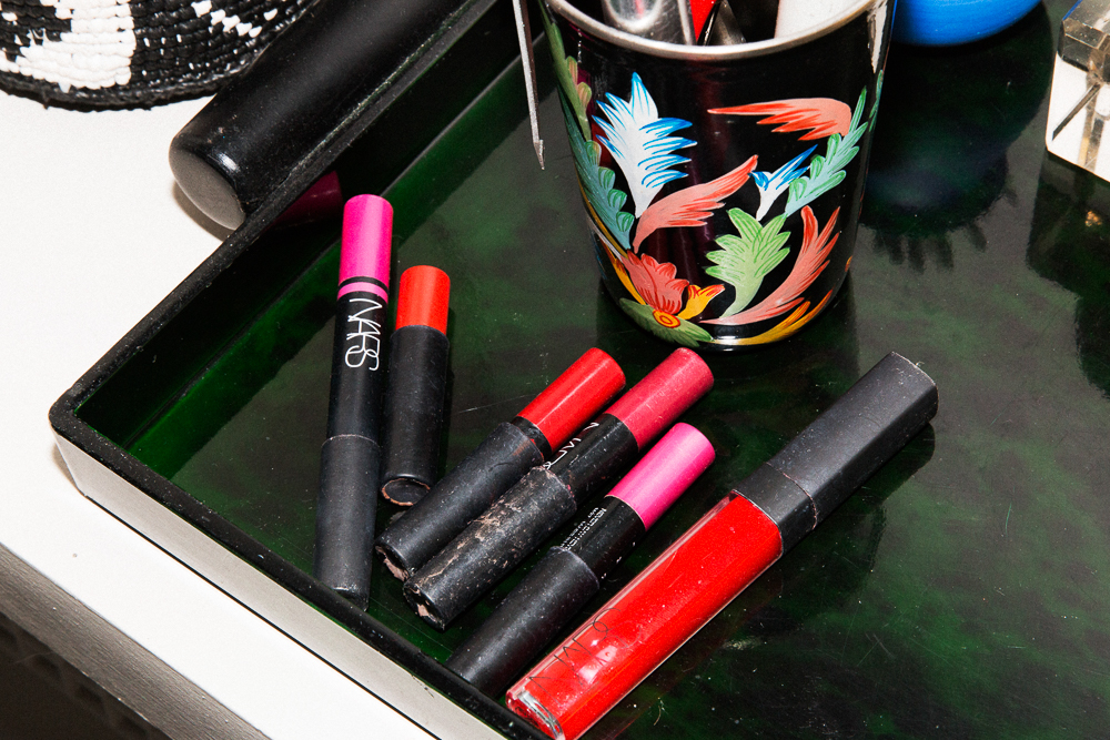 I’m big on lipstick. First thing in the morning, I like to put on a bright red. It helps because I work from home, and I don’t have coworkers around me, so I need to feel awake. I always like Nars Lipsticks. Every day I wear either Funny Face or Red Lizard. I am surprised I don’t have a pink finger here, like how my dad had yellow fingers because he was such a chain smoker…but I put on lipstick and immediately smudge it in because I want it to look stained. I'll transition it into nighttime by freshening it up.