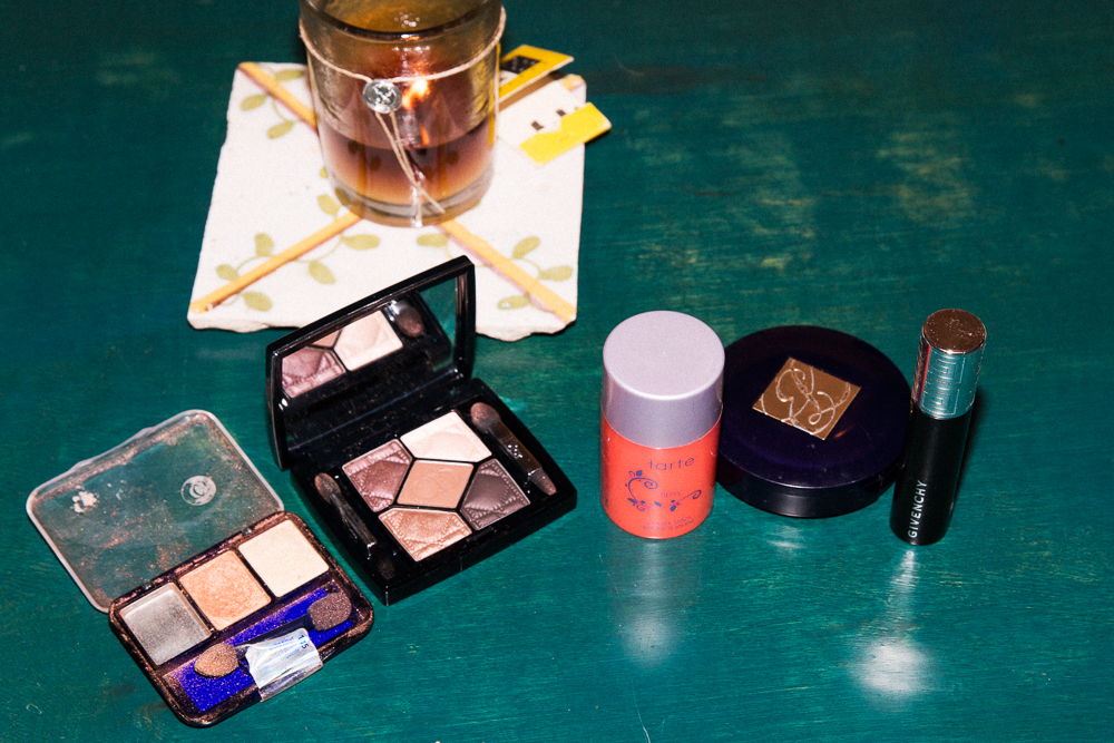 If I’m going out, then I’ll do some foundation, especially when I feel really broken out like right now. I use Estée Lauder Double Wear Stay-in-Place Powder Makeup in Desert Beige. Then I’ll use this Diorskin Nude Skin Perfecting Hydrating Concealer for spots. Do you know that brand Prescriptives? It doesn’t exist in stores anymore—only online—but they have a really good spot concealer called Camouflage Cream. Then I’ll use some blush or something. I like this Tarte Cheek Stain in Tipsy. One time I got my photo taken and was uncomfortable, but the makeup artist used this cheek stain, and I thought it was glimmery and nice. It’s skinvigorating. [Laughs]