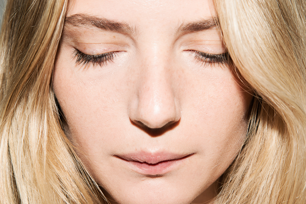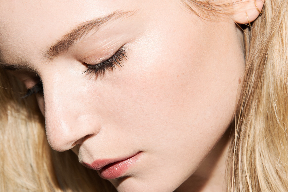 Turning Camilla’s face toward the light, Quinn applies Laura Mercier's Secret Camouflage to a few blemishes and Secret Concealer for the under-eye. Then he begins his foundation work, explaining, “The most important part to finding the right foundation is good lighting. Whenever you shop for one at a department store, make sure to take a sample and see what it looks like on your skin in natural light. It will be the most honest application.” Another important part of shade-matching: making sure your face matches the rest of your body. Tugging Camilla’s top down so her collarbone shows, Quinn checks to make sure the whatever shade he uses won’t leave lines on her décolletage or upper arms.