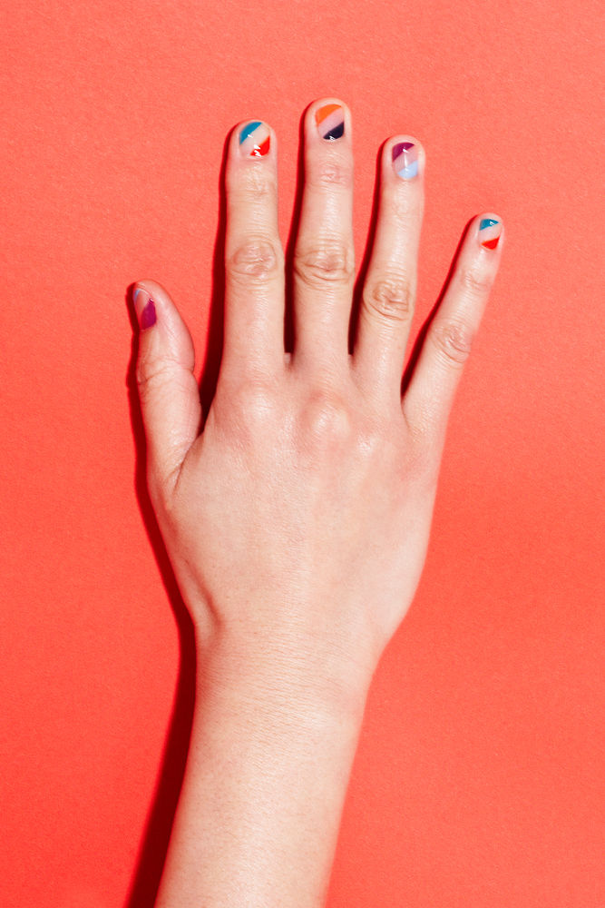 Now, before we get ahead of ourselves here, none of this is to say nude nails or minimalist nails are bad “Everything is a color,” Madeline clarifies. “And I like all colors,”), but why limit yourself to one color per manicure—or even one color per nail? Madeline's first look (demonstrated on Kiki Kudo, who brought her delicious Chi-So NYC bento boxes) took advantage of six colors plus some negative space—so your nude is built in there. “I really like a lot of bright colors at once,” Madeline said—proving why she's been a Sally Hansen Global Brand Ambassador for a year with no plans of stopping (COTY is a damn fine matchmaker when it comes to partnerships). “With the skin coming through, it makes it a little less oversaturated,” Madeline said. Also, file this one as nail art particularly well-suited for short nails. It looks better when there isn't grown-out nail showing in the negative space.