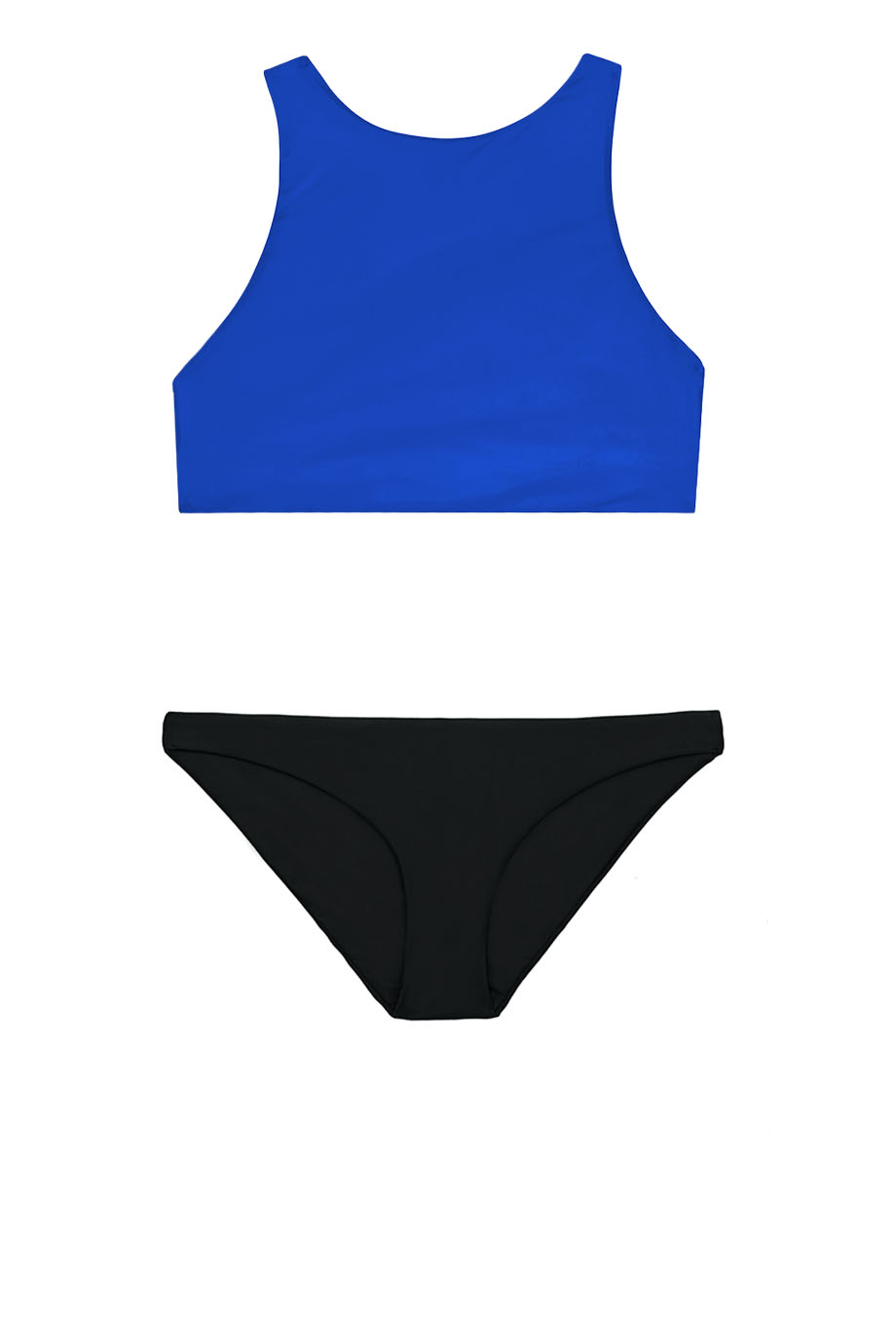 Bikyni The Crop in Monaco and The Tieless String bottom in Jet : For your inner Blue Crush leading lady, this top is cropped above the rib cage with a supportive, fitted cut that's as comfy as a sports bra. Wear it with uncomplicated bottoms that sit low on the hip without extraneous side ties or any trace of embellishment.