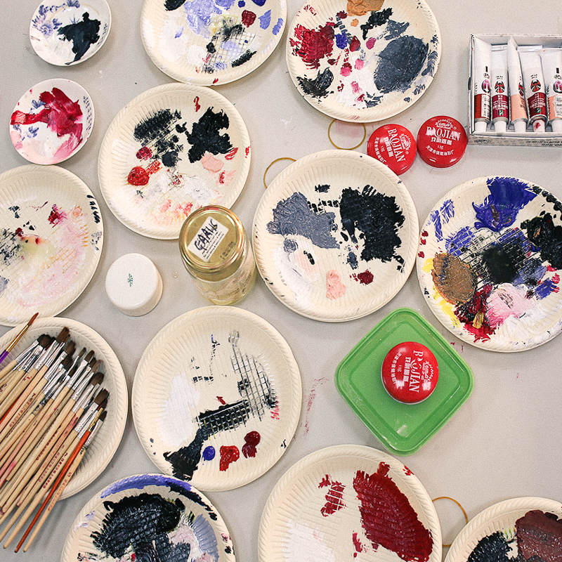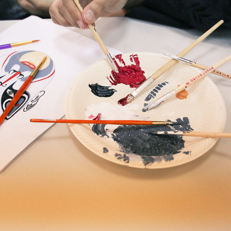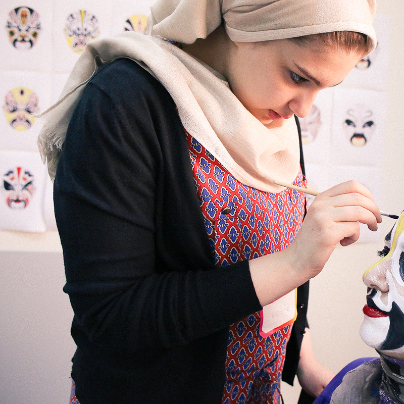 Of interest to you is a workshop I’ve been covering over the week. Shanghai-based designer, Ailadi Cortelletti, and professional opera singer, Gao Mingbo, have been teaching students face-painting techniques used in traditional Beijing opera, called Lian Pu. Referred to as “painting of the heart and soul,” Lian Pu is high impact full-face makeup that exaggerates performers’ expressions and emotions for the audience. Colors are also symbolic of character traits—for example, red is for bravery, blue denotes strength, gold/silver are signs of the supernatural (e.g. gods and spirits), and white equals treachery, etc. As a performer, Mingbo is a Lian Pu expert; his professional training began when he was young, and he brought traditional Chinese paints, powders, and brushes with him to the desert.