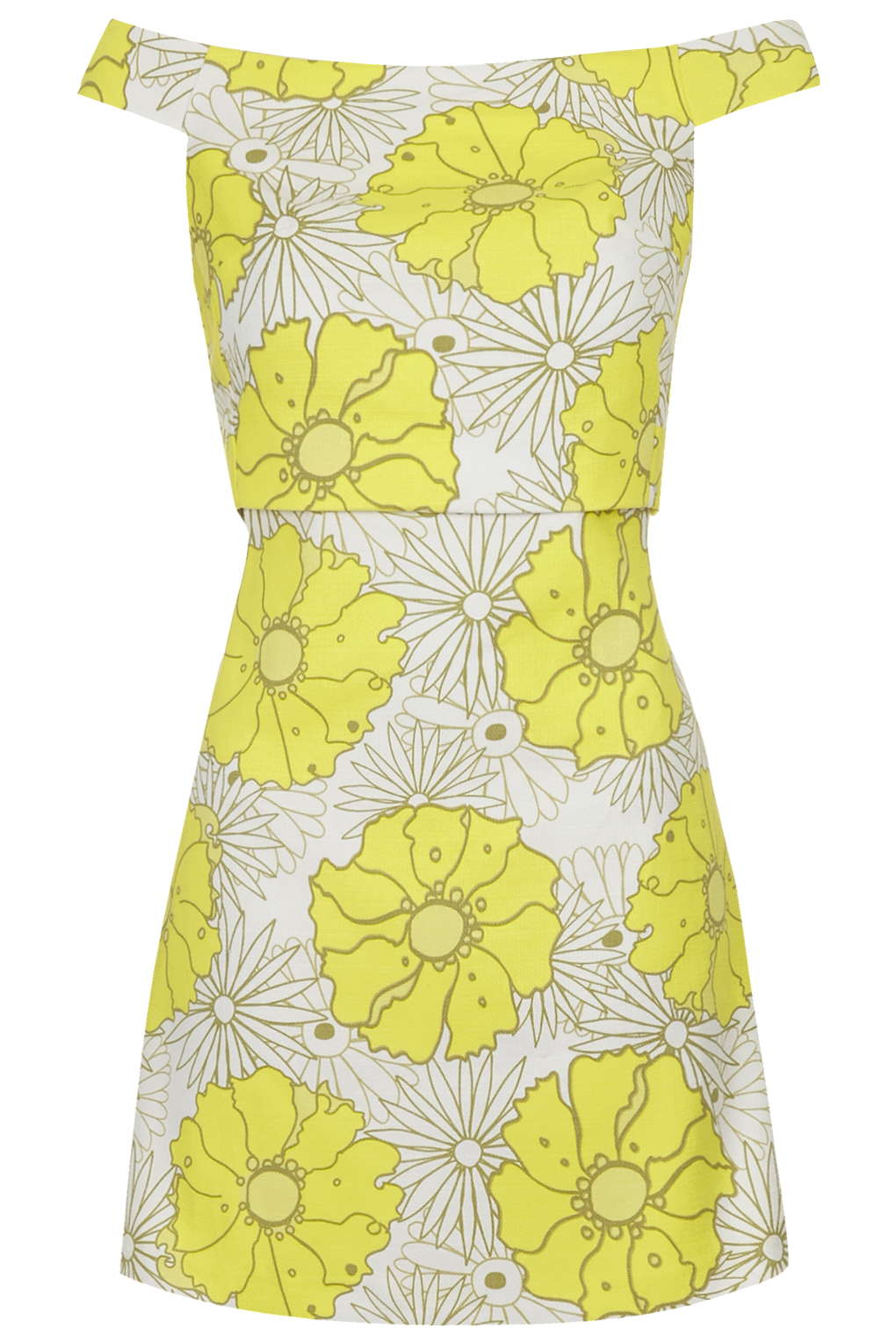 Topshop Floral Print Bardot Dress: This color looks best with darker skin tones, but it's attached to a silhouette that will work for those on both the shorter and the taller sides, as long as you make it past the (admittedly somewhat challenging) task of going braless or strapless. But from there on out, it's all blue skies and bright fluro daisies.