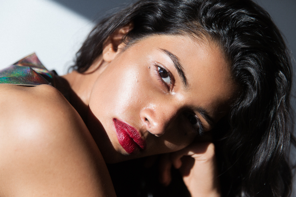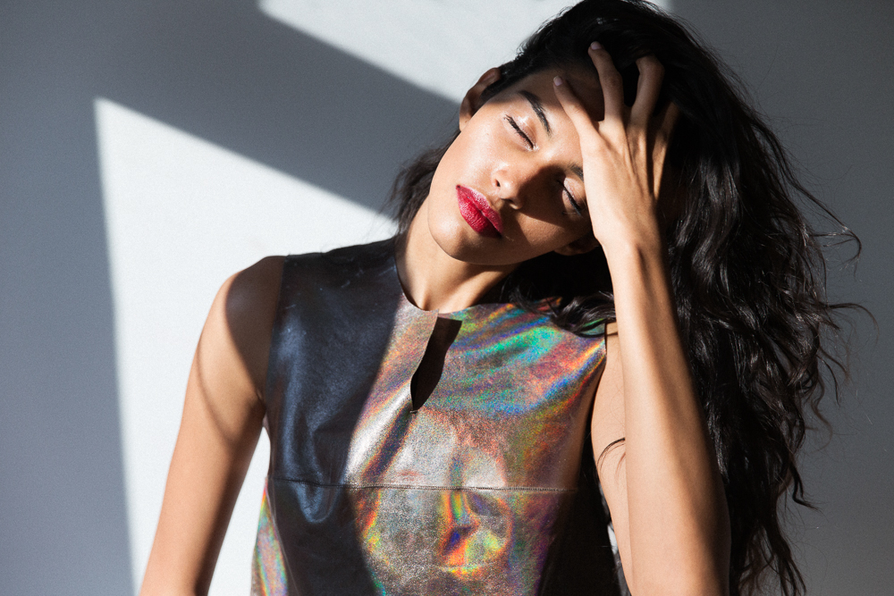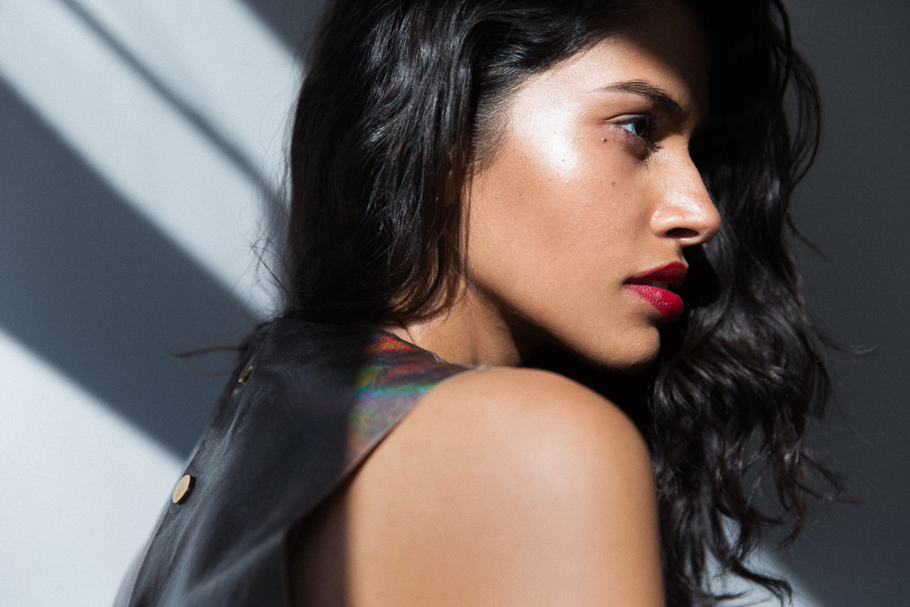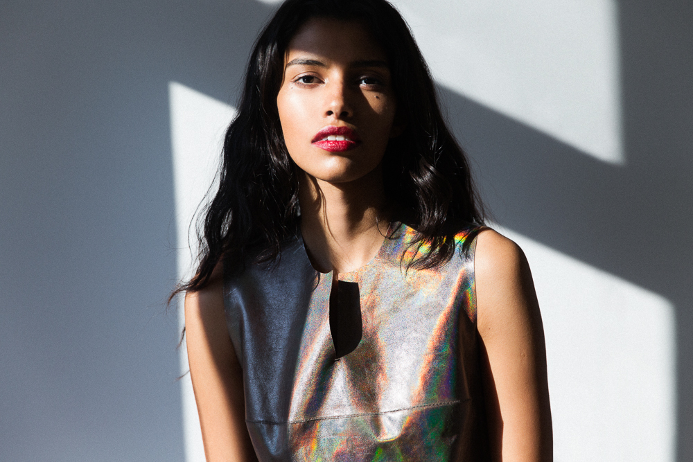 There are models that have a great debut season with a zillion shows, and then there are models who casually debut at Louis Vuitton Cruise 2015 Collection in Palm Springs with no priors to speak of. Pooja is in the latter category. Before walking in Nicolas Ghesquière's Star Wars extravaganza for Vuitton a few weeks back, Pooja was studying computer engineering. Suffice it to say, Pooja is good at a number of things (“If I can go from that to modeling, you can really do anything')—but admittedly isn't particularly familiar with makeup. Inquisitive as ever, she picked up Josie Maran's Argan Enlightenment Illuminizer, left over from a different shoot, and started experimenting...until she was completely covered in the stuff. Luckily, it's thin—so instead of a major case of disco-ball face, all she was left with was a slight veil of iridescence.