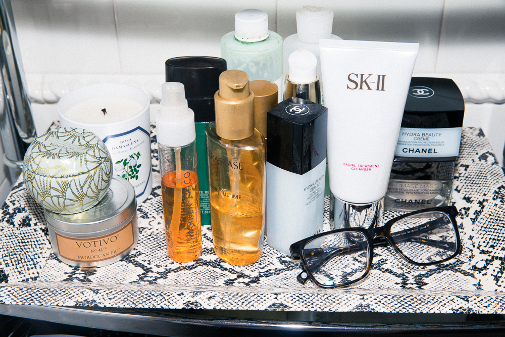 I feel like, with black hair it gets really dry, so I keep these three products in rotation: the Shu Uemura Ultimate Remedy Duo-Serum, the Kérastase Elixir Ultime, and Warren Tricomi’s argan oil, which I get when I go to the salon. With extensions, these products really protect the style. And because I can’t do dry shampoo, if I’m going out and my hair is too dirty, I’ll just wash the top of my hair in the kitchen sink and blow it out.