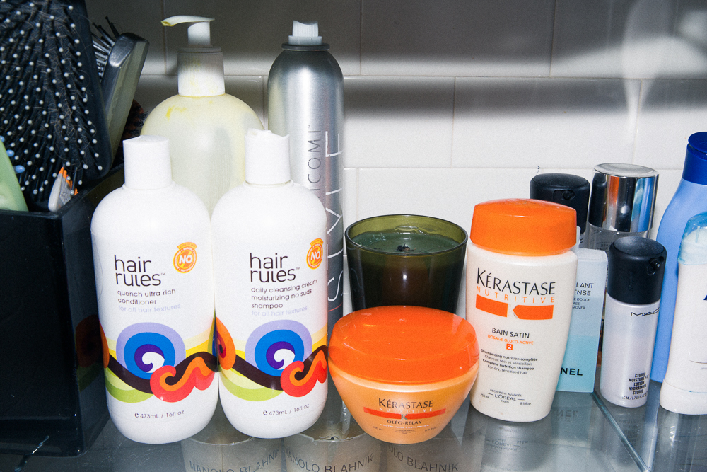OK, so when I do it myself, I use a flat iron to do all the waves and curls. I just like how it looks better. It’s a little choppier, but still polished. If I am washing my hair and wearing it curly, I only really trust Hair Rules. I co-wash it during the summer—it’s just washing your hair with conditioner and not shampoo. The Quench Conditioner is really good. And then, when I wear my hair straight, I use a lot of Kérastase. I use the Bain Satin Shampoo and Oléo-Relax Masque as conditioner.