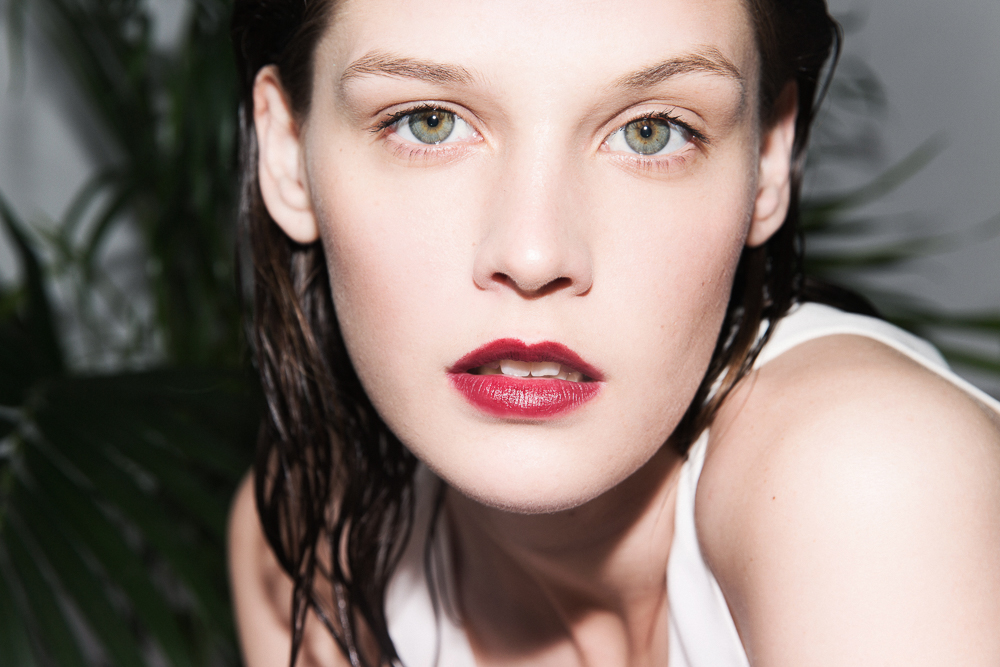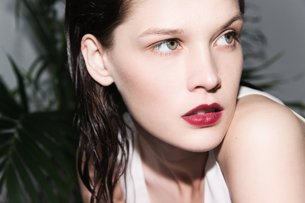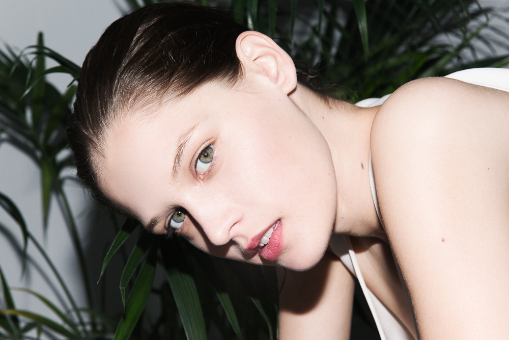 Now, the photos you see above are not the first time we photographed Angel. She actually came in the week before wearing a flannel vest and without a stitch of makeup, just to say hi and take a few pictures. And then her agency, The Lions, emailed—'What was she wearing? Too grungy?” Now, there's no such thing as too much grunge, but the email sparked some discussion. How would we make up up Angel if given a little more time? The Lions was game to go down that road, so the next week, back she came, in a plain white tank and wet hair.
