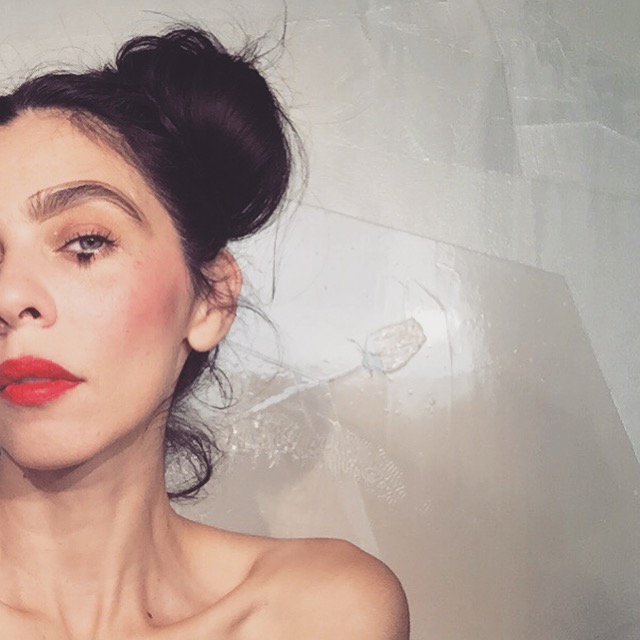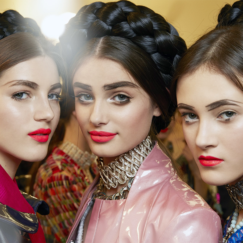 And because the rest of the face is soft and muted—albeit impeccably illuminated—the resulting lip look needs to pop. A matte fuchsia-red lipstick is the way to go, but if you don't have your perfect shade, you can always blend two lipsticks together. Line your lips and feather them in with a blue-based red, then follow up with a cherry and fuchsia lipstick and blend the colors together. Your own custom Rouge Coco lip color, insert name here. Take this face to dinner—drinks afterward, let's not have it go to waste.