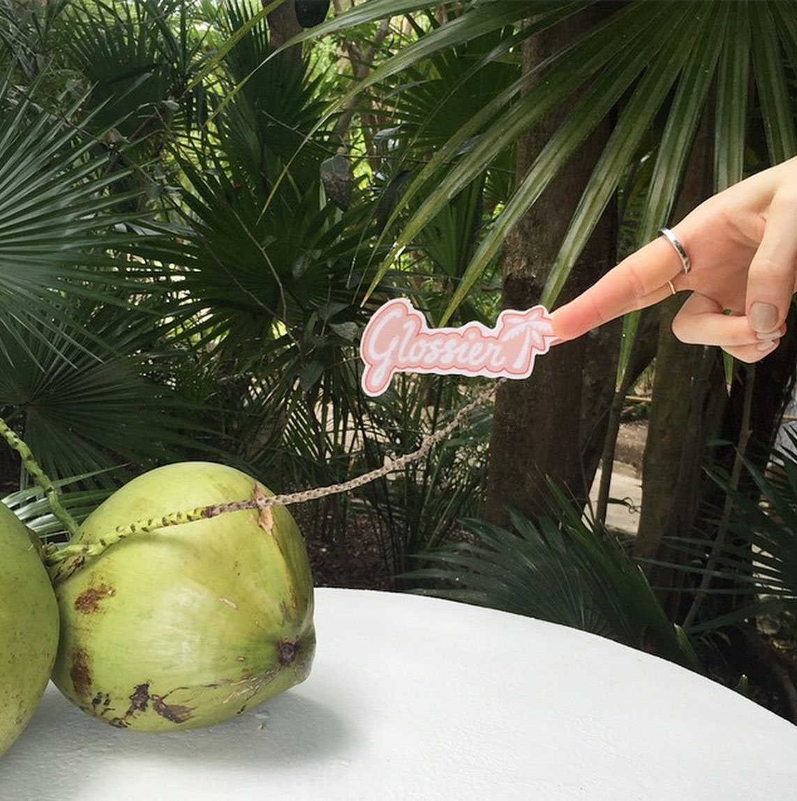 From there we, the Glossier creative team, kicked off campaign ideation as we always do with a shared photo stream where we upload photos and videos and memes—a digital moodboard, if you will. Lots of The Blue Lagoon screen grabs, and a few O.T. Genasis references... Helen and Adriana got to work on the packaging—a chic little laminated foil tube with an orange punch-cap with an equally chic, leafy outer box. Emily and I, along with our model, Earth angel Belle (Emily met her on Instagram), flew to Hotel Esencia outside of Tulum for the shoot. This part was * *absolutely critical * * as the visuals had to accurately portray the transportive nature of the scent. When talking coconuts, go where the coconuts are.
